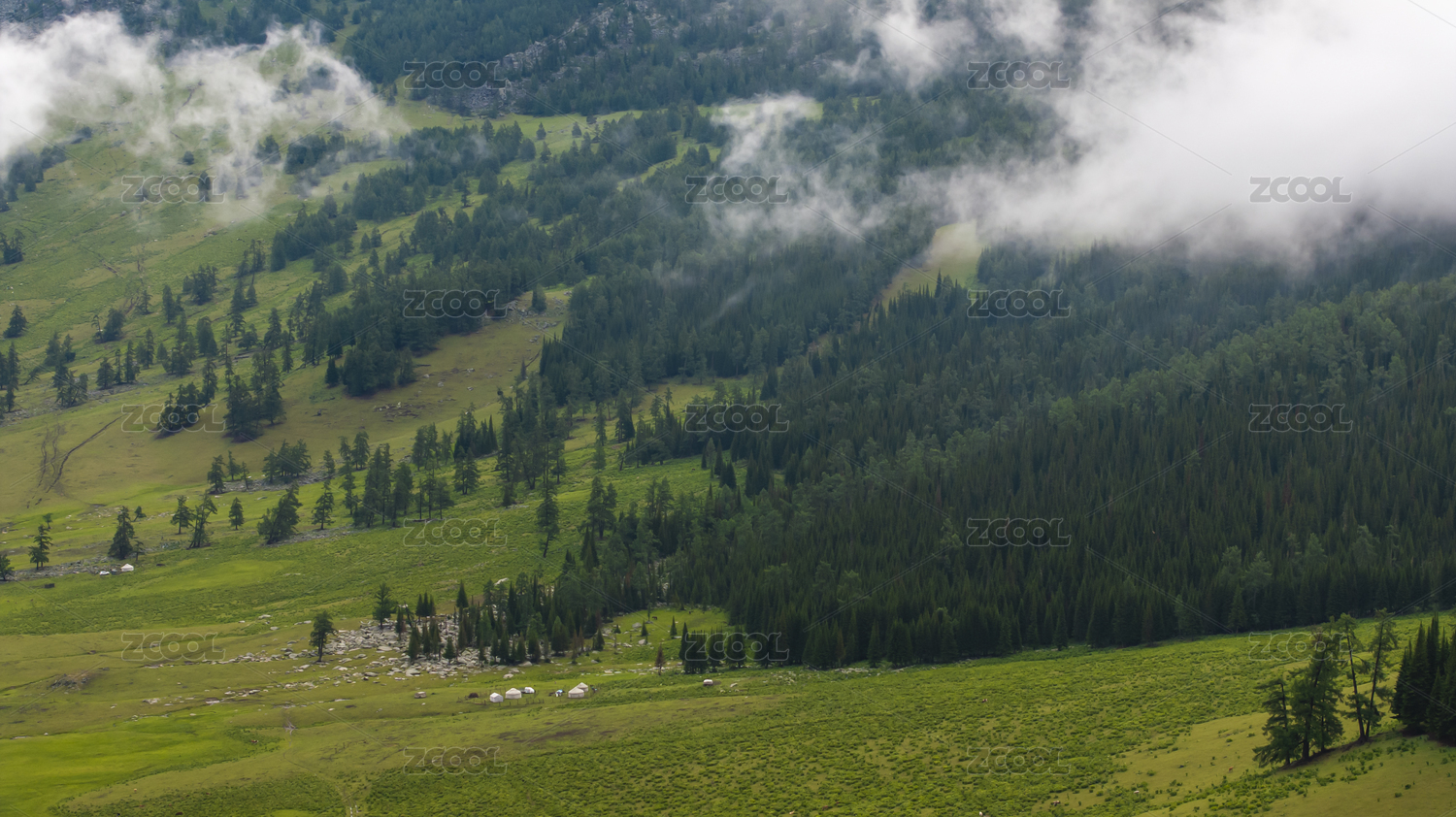 中国新疆阿勒泰云雾缭绕的森林航拍