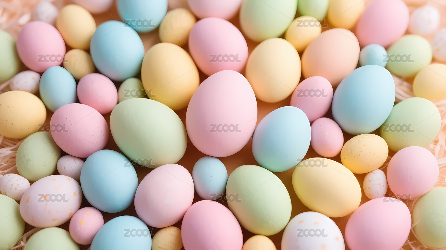 粉红色背景上一组彩色鸡蛋的特写高清图片