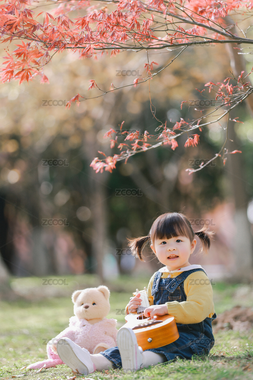 园林里坐在地上玩耍的穿着汉服的小女孩