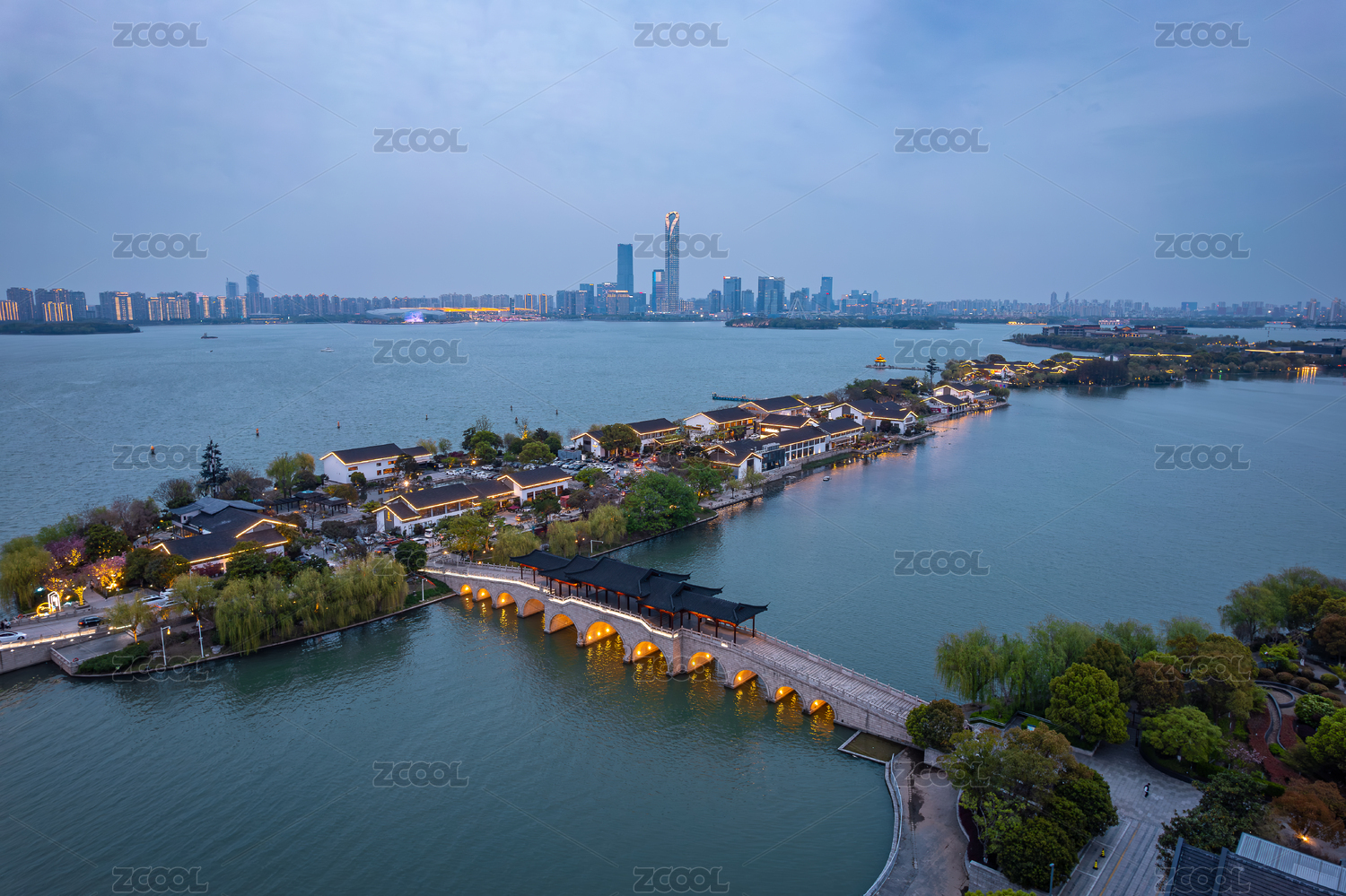 航拍黄昏时分的苏州金鸡湖现代城市风光