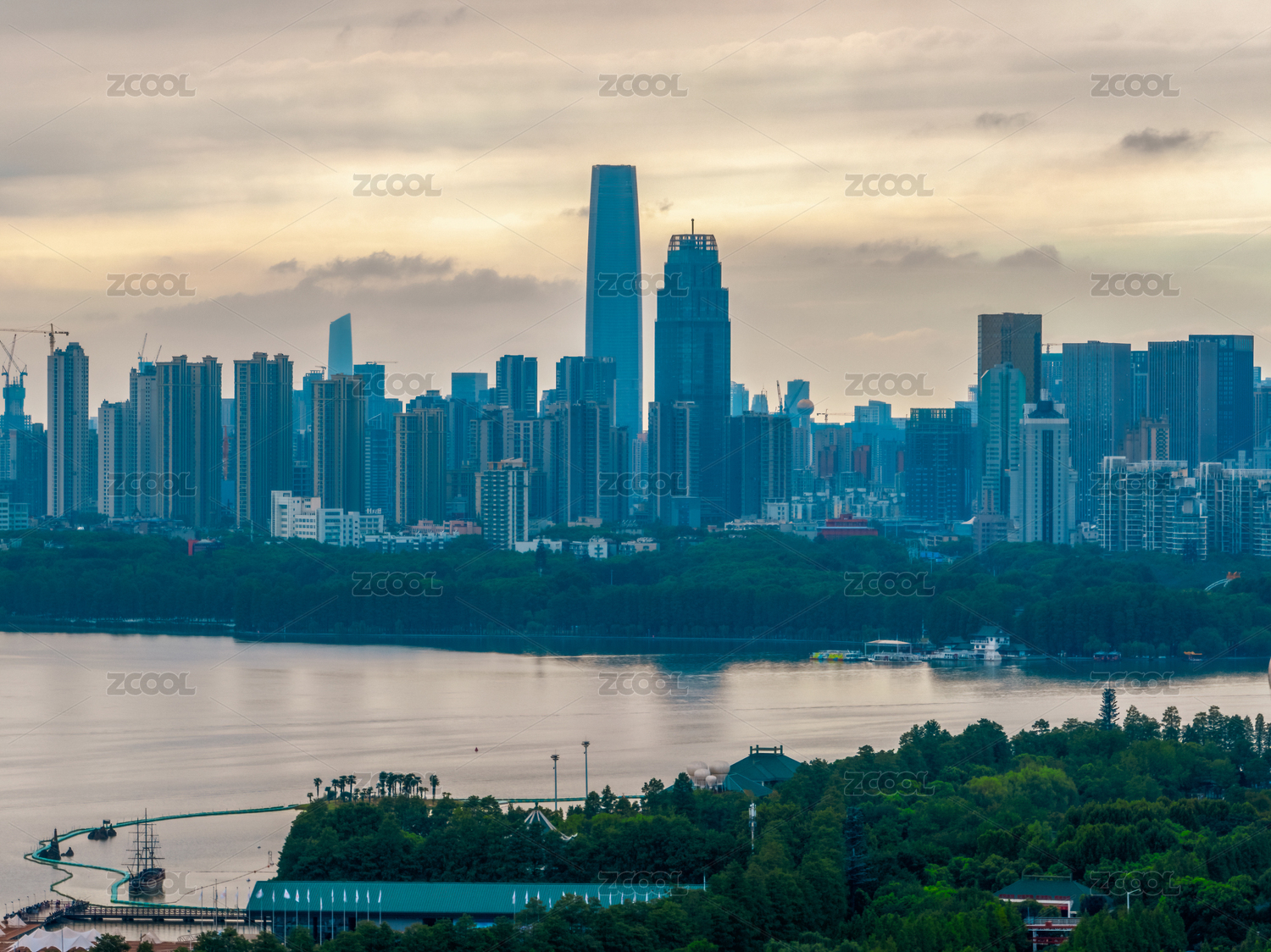 夏季武汉琴台大剧院月湖风景区城市天际线日