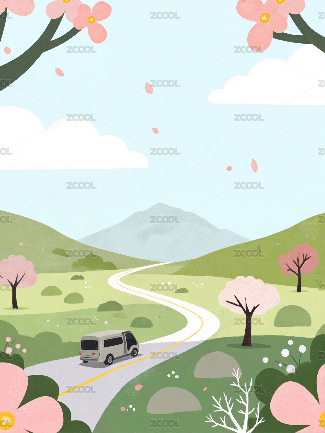 AIGCFG02,春天,草地,天空,风景,汽车,车,公路,卡通,插画