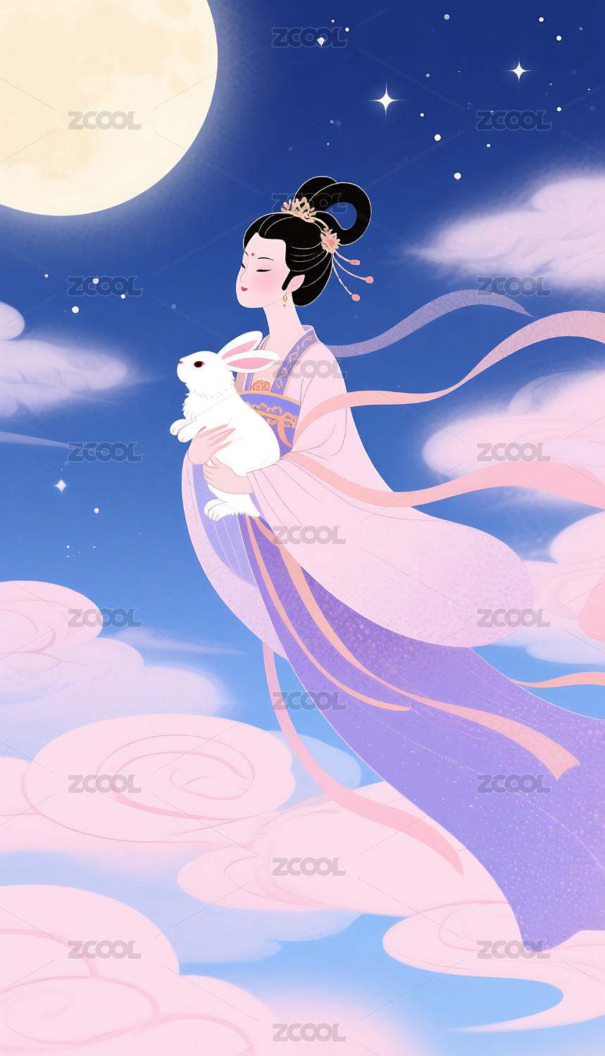 中国风,中秋节,节日,嫦娥,玉兔,插画,月亮