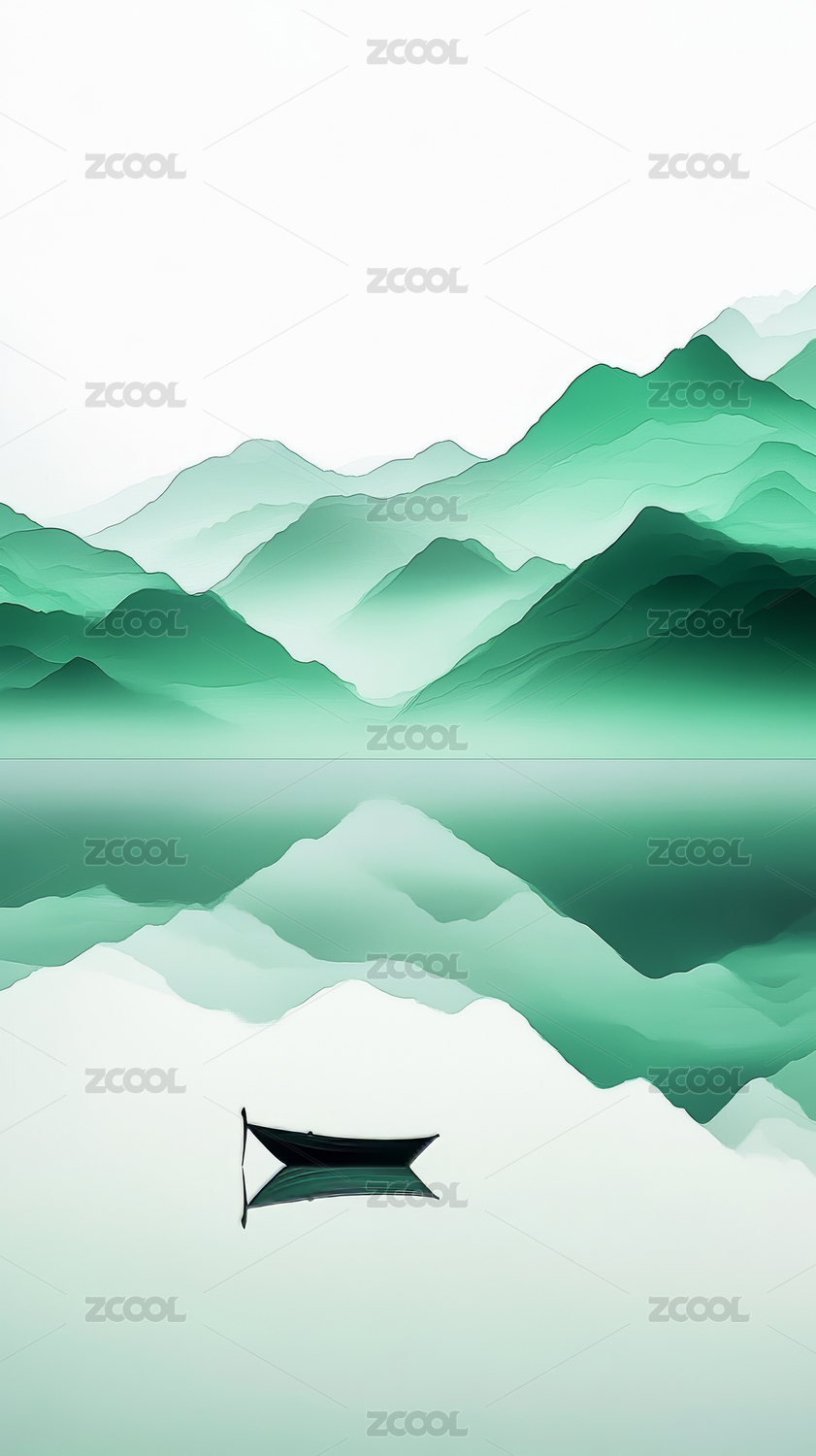 水墨山水倒影孤舟
