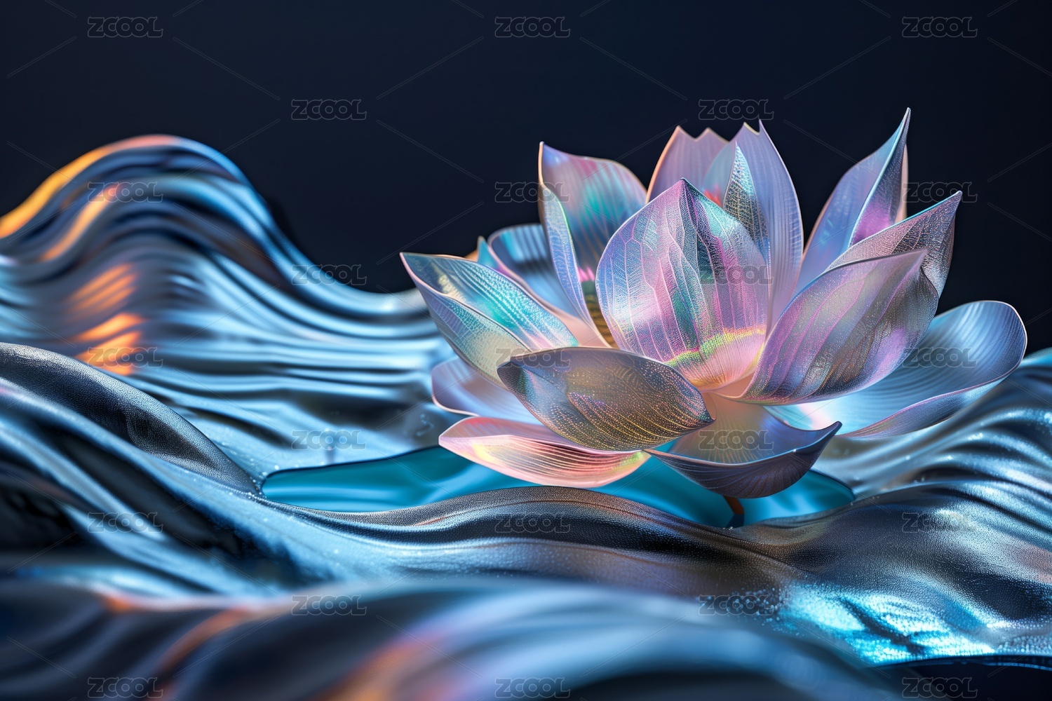 黑底金属荧光色水中漂浮的莲花荷花3D插画