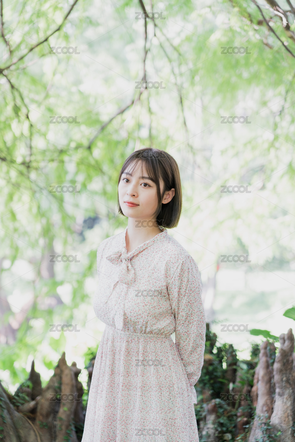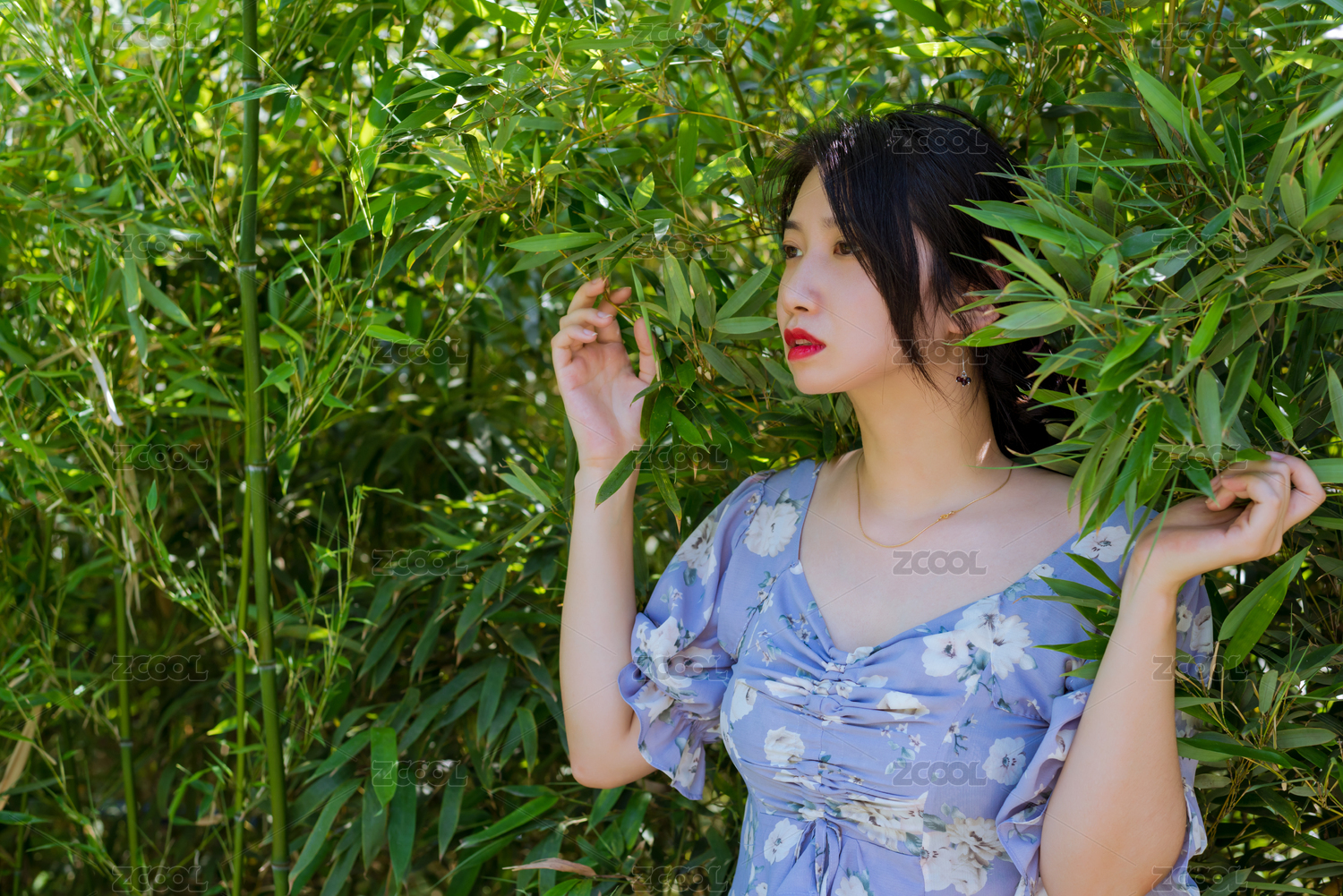 年轻漂亮的女孩和竹叶背景,夏天户外人像