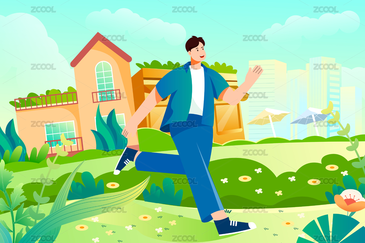 卡通手绘女孩夕阳下奔跑唯美banner通用背景插画