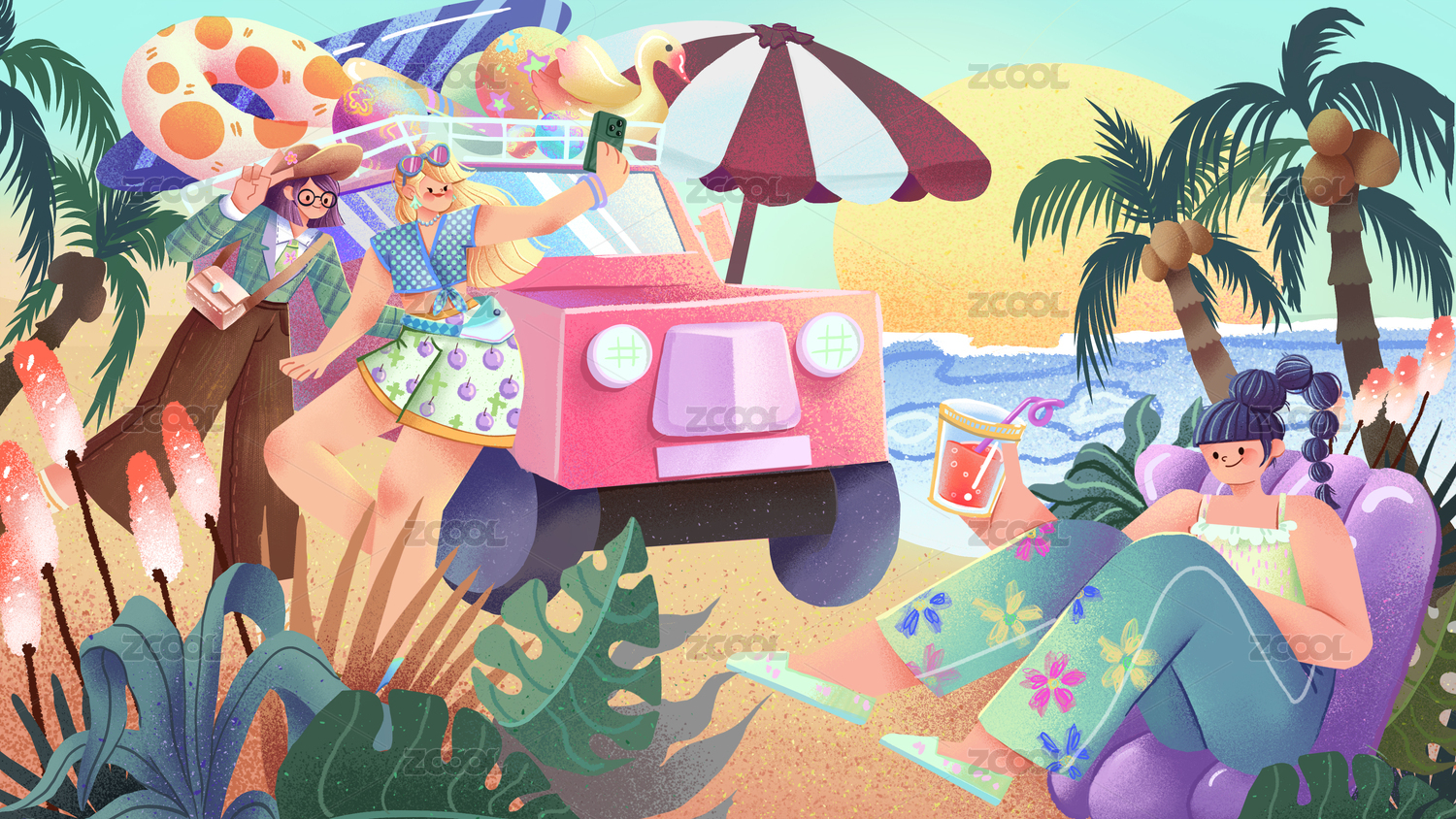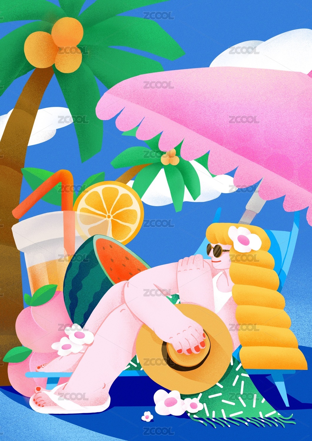 夏日女孩冷饮海滩度假扁平风肌理插画