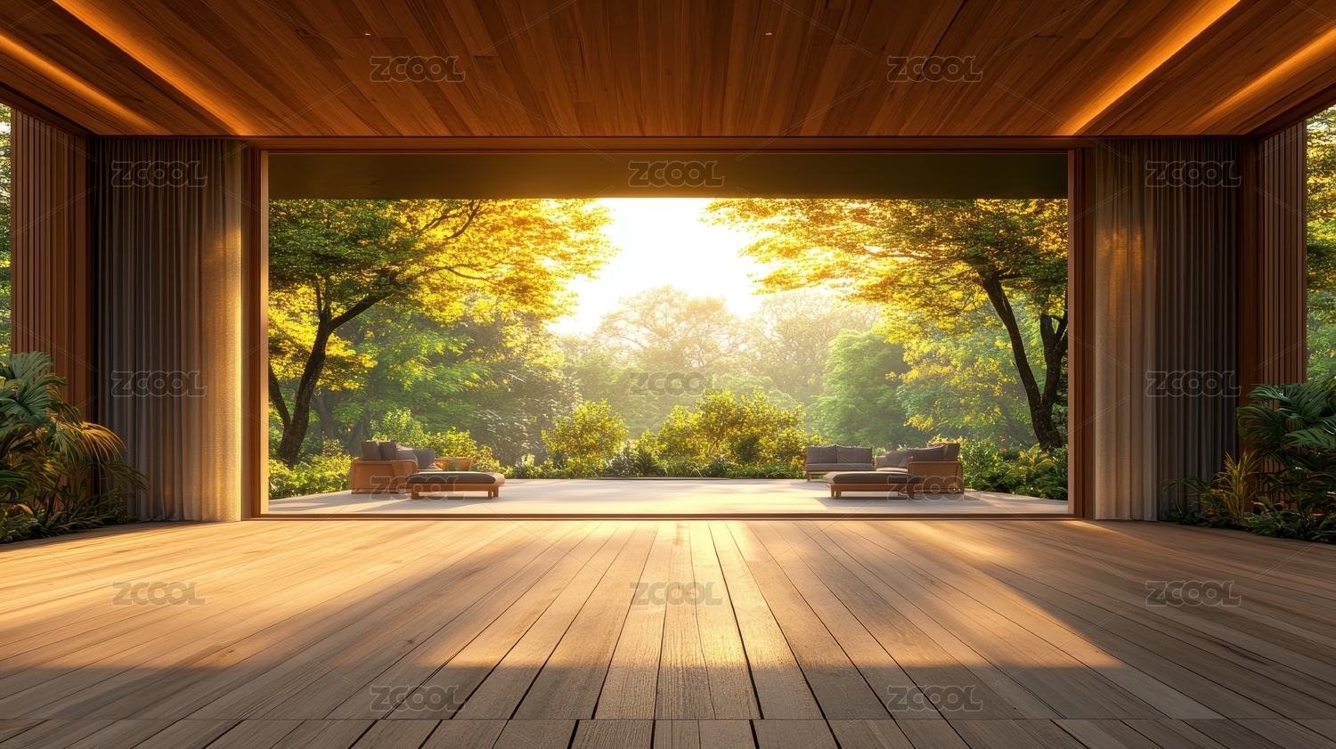 阳光洒落木质别墅庭院