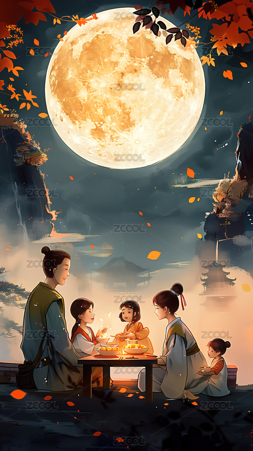 中秋节的夜晚一家人欢乐的吃饭赏月 夜晚月亮背景和家人一起吃月饼插画