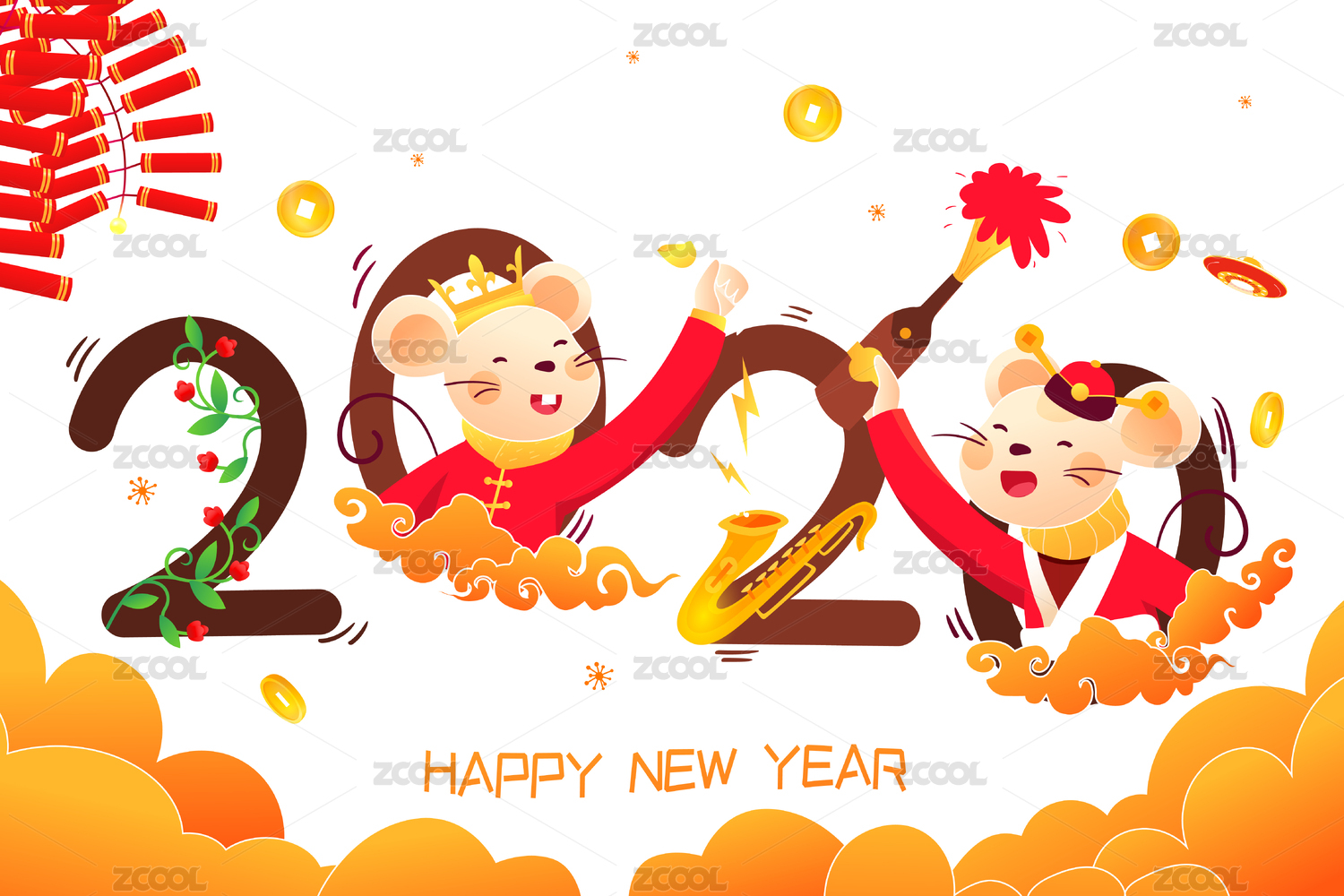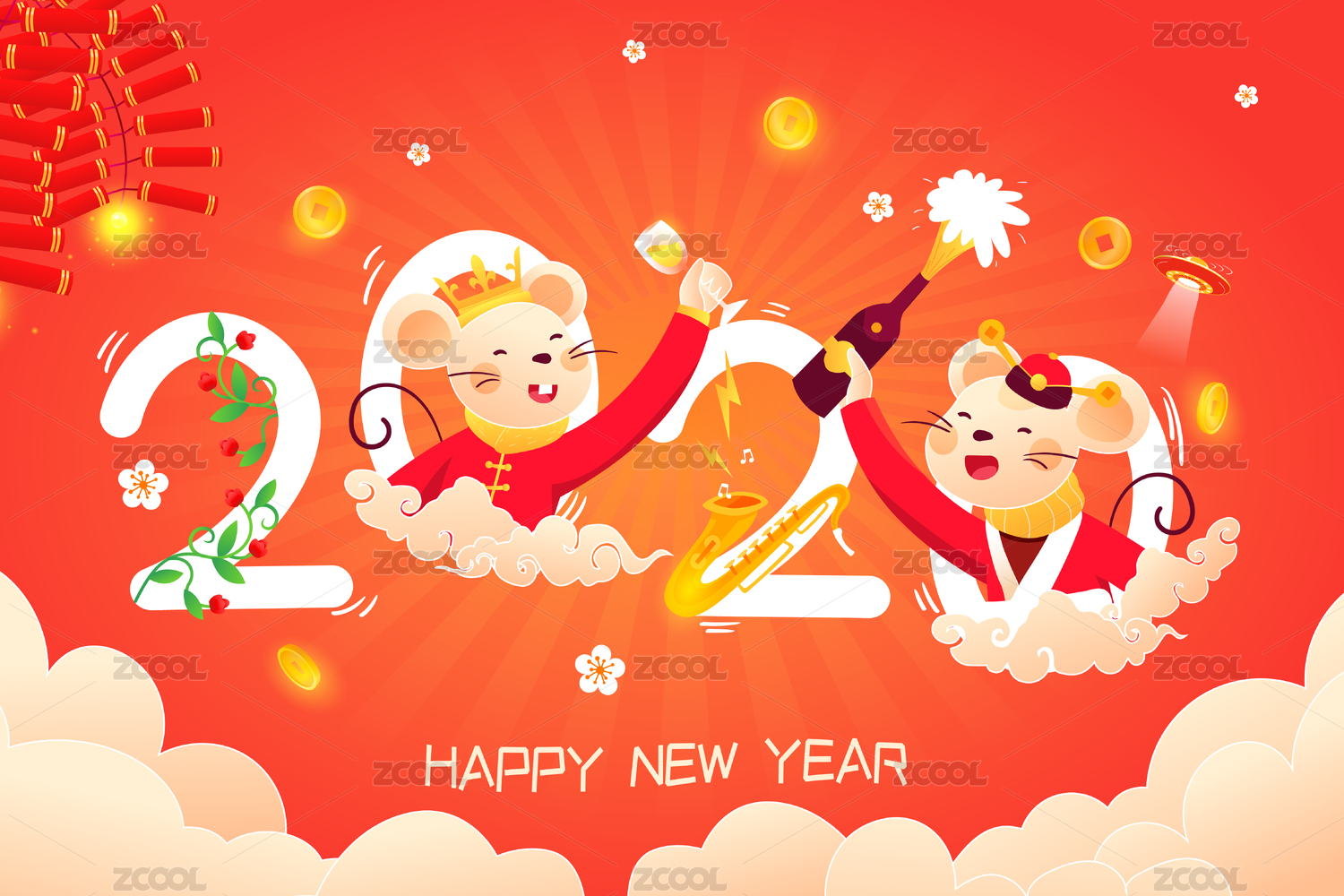 新年,鼠年,新春,春节,2020,老鼠,爆竹,元宝,卡通,喜庆