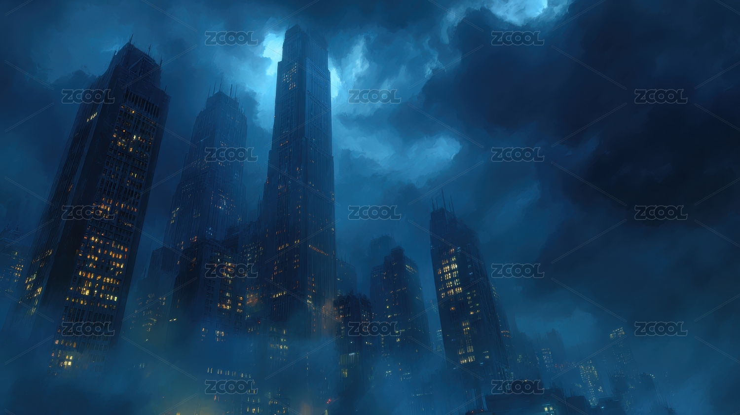 神秘,天空,朦胧,云层,迷雾,城市,高楼,建筑,剪影,静谧