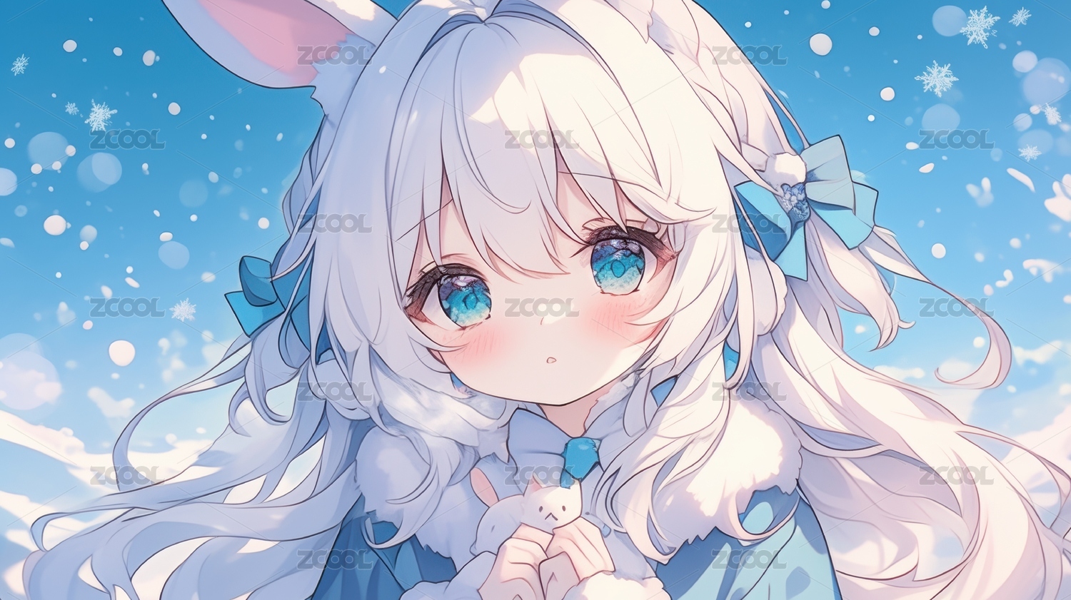 雪中抱着玩偶的兔耳少女