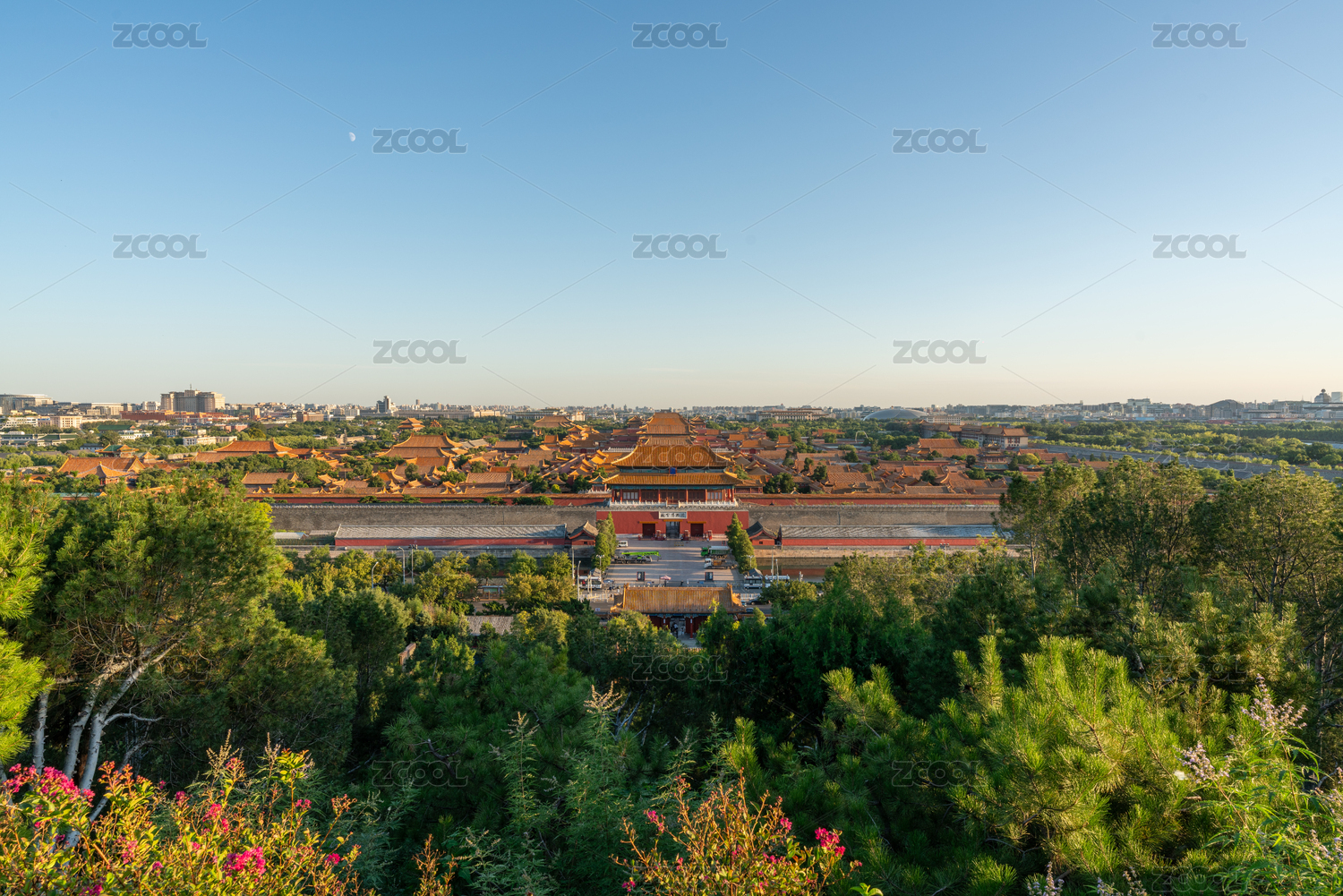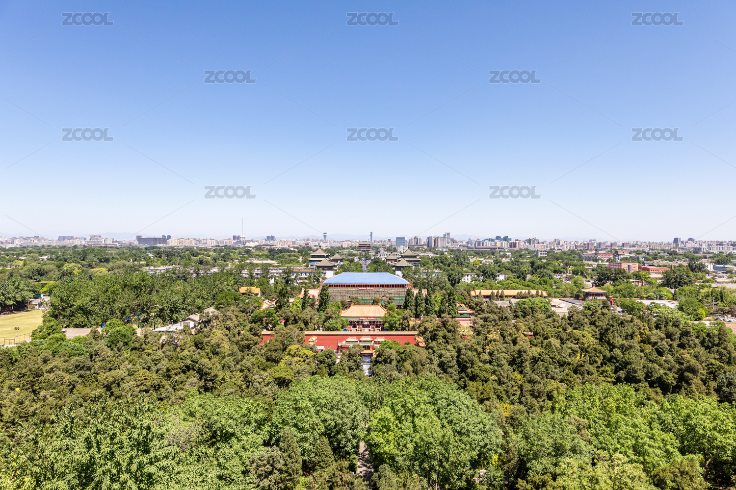 从中国北京景山公园向北看北京中轴线北段:寿皇殿、鼓楼、钟楼、盘古大厦、奥森公园