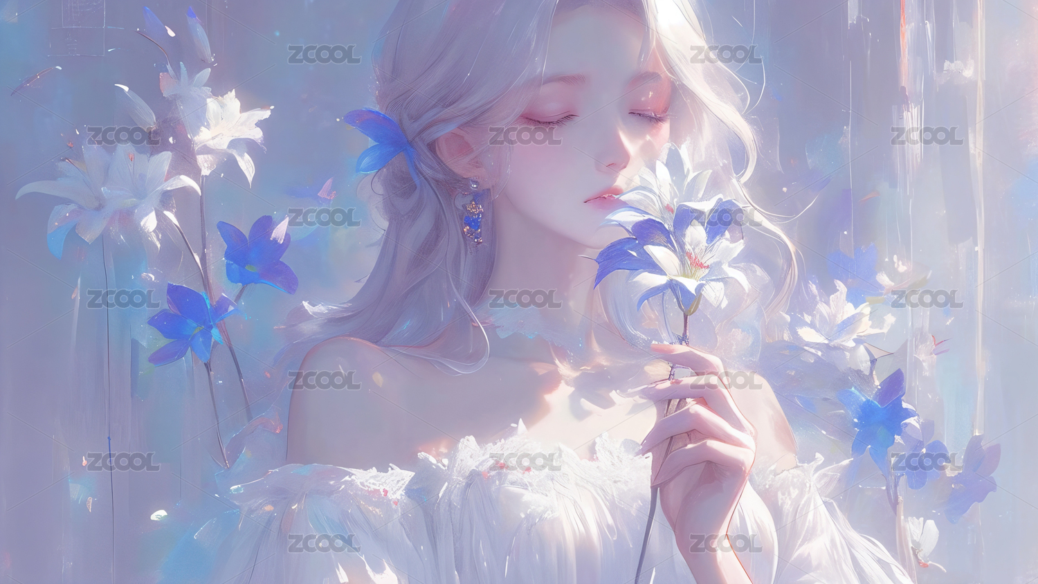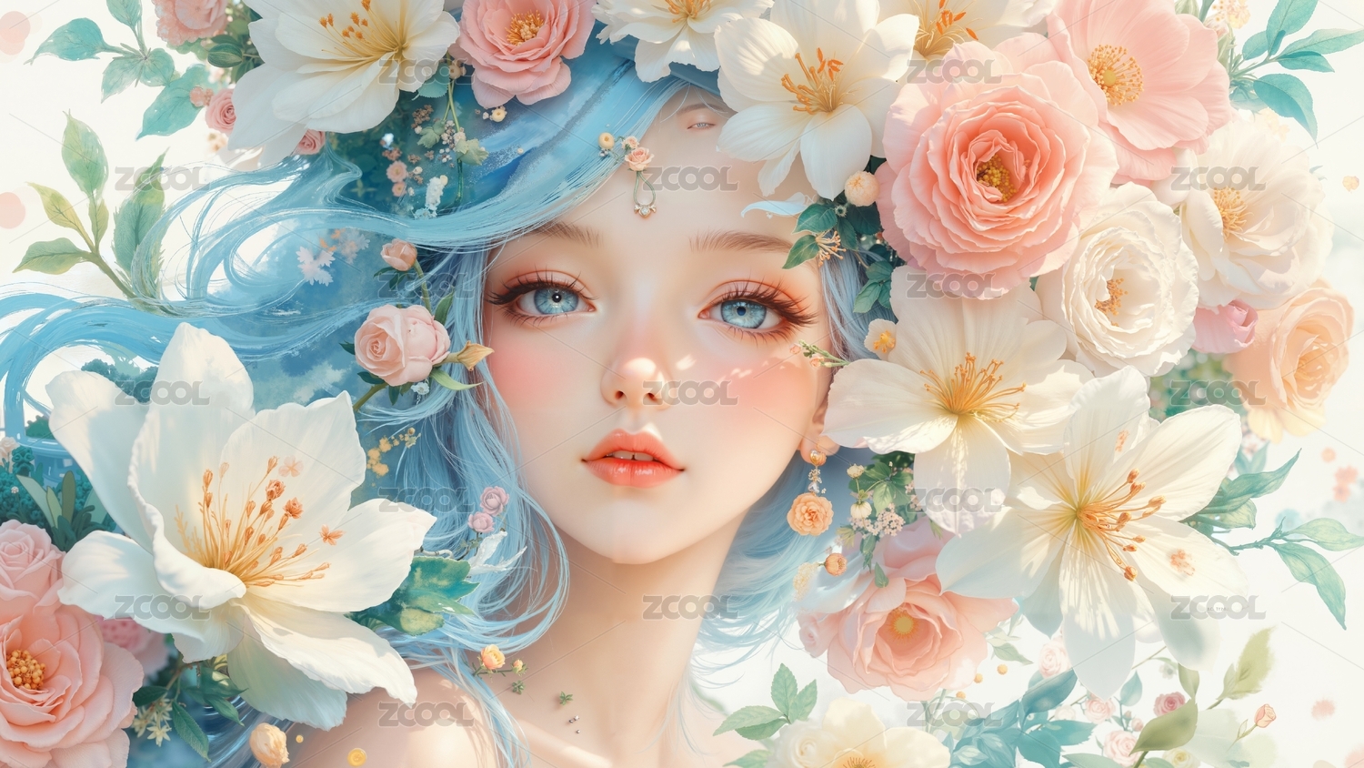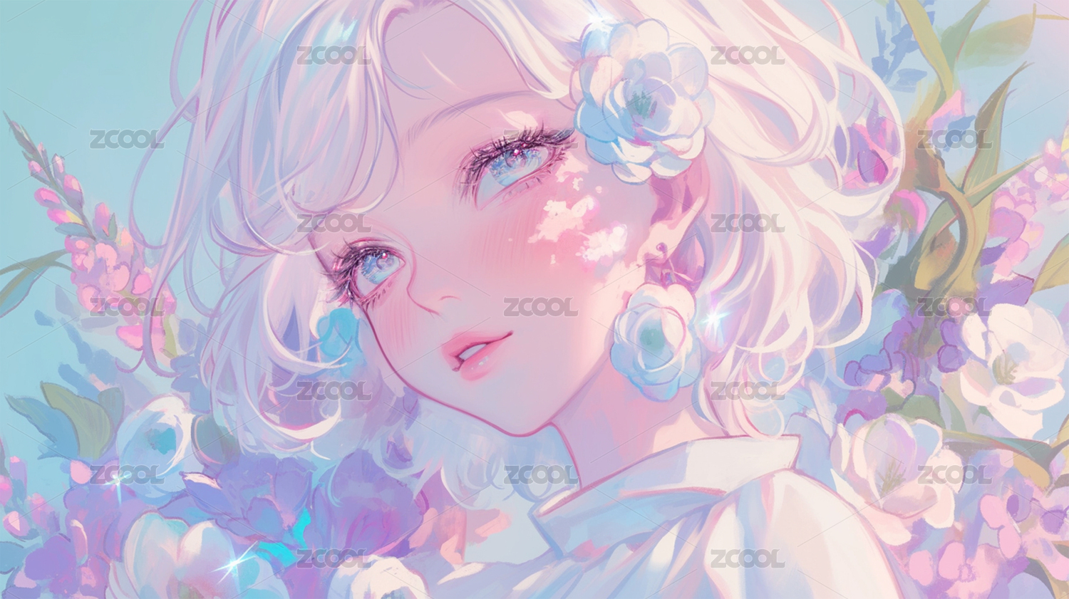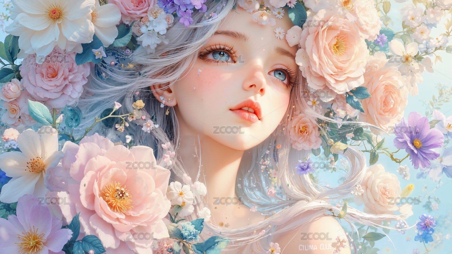 少女,雪白发丝花朵点缀,蓝色眼眸似梦幻