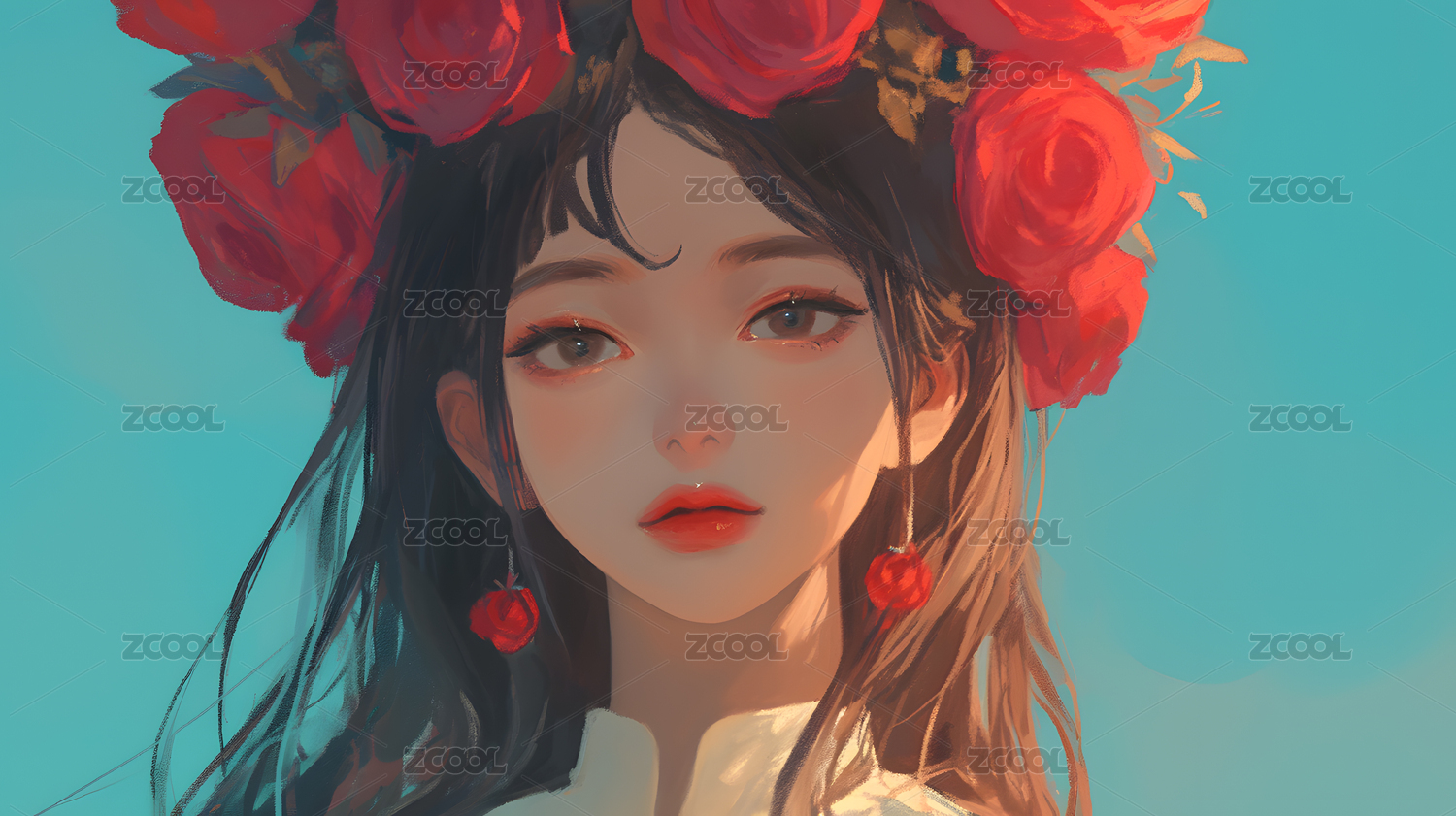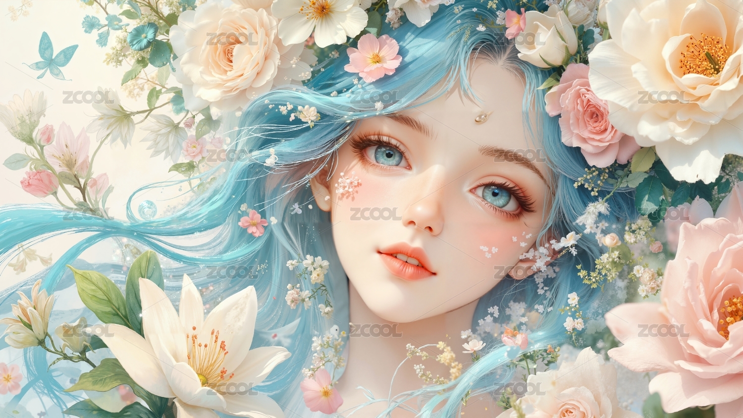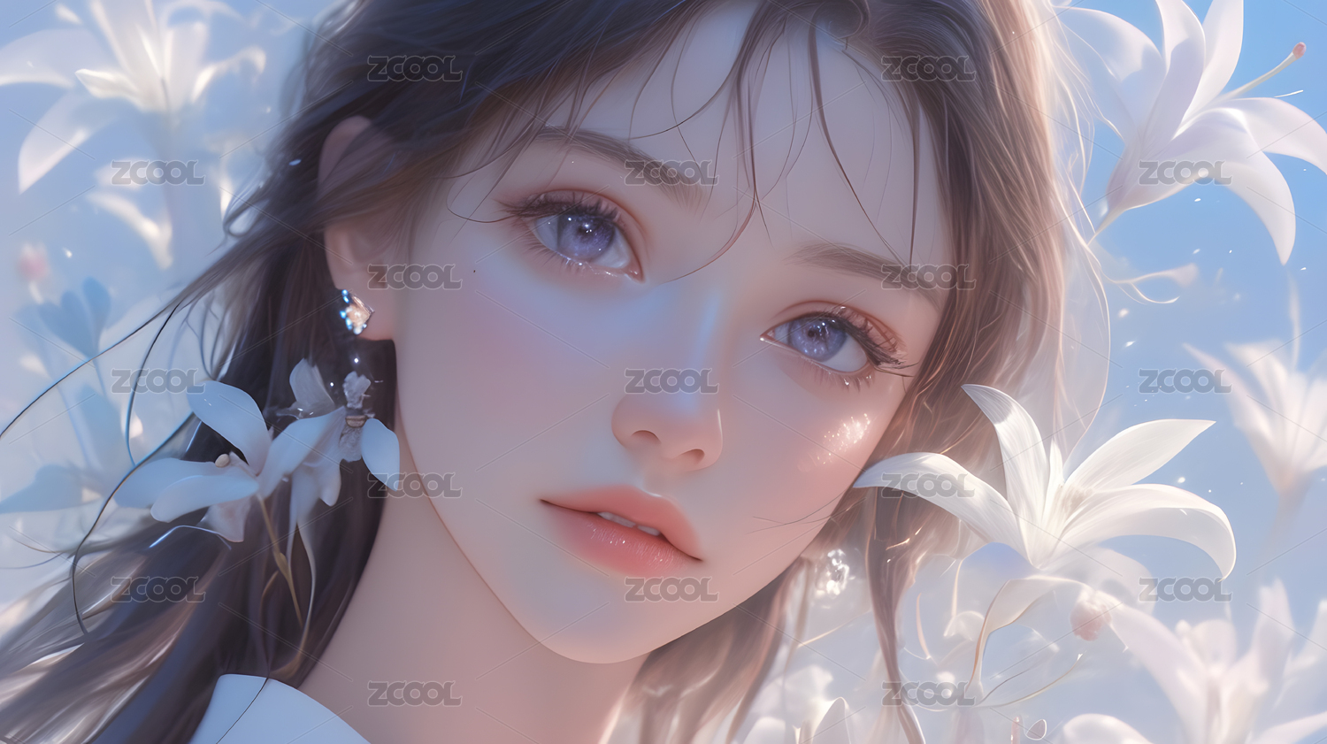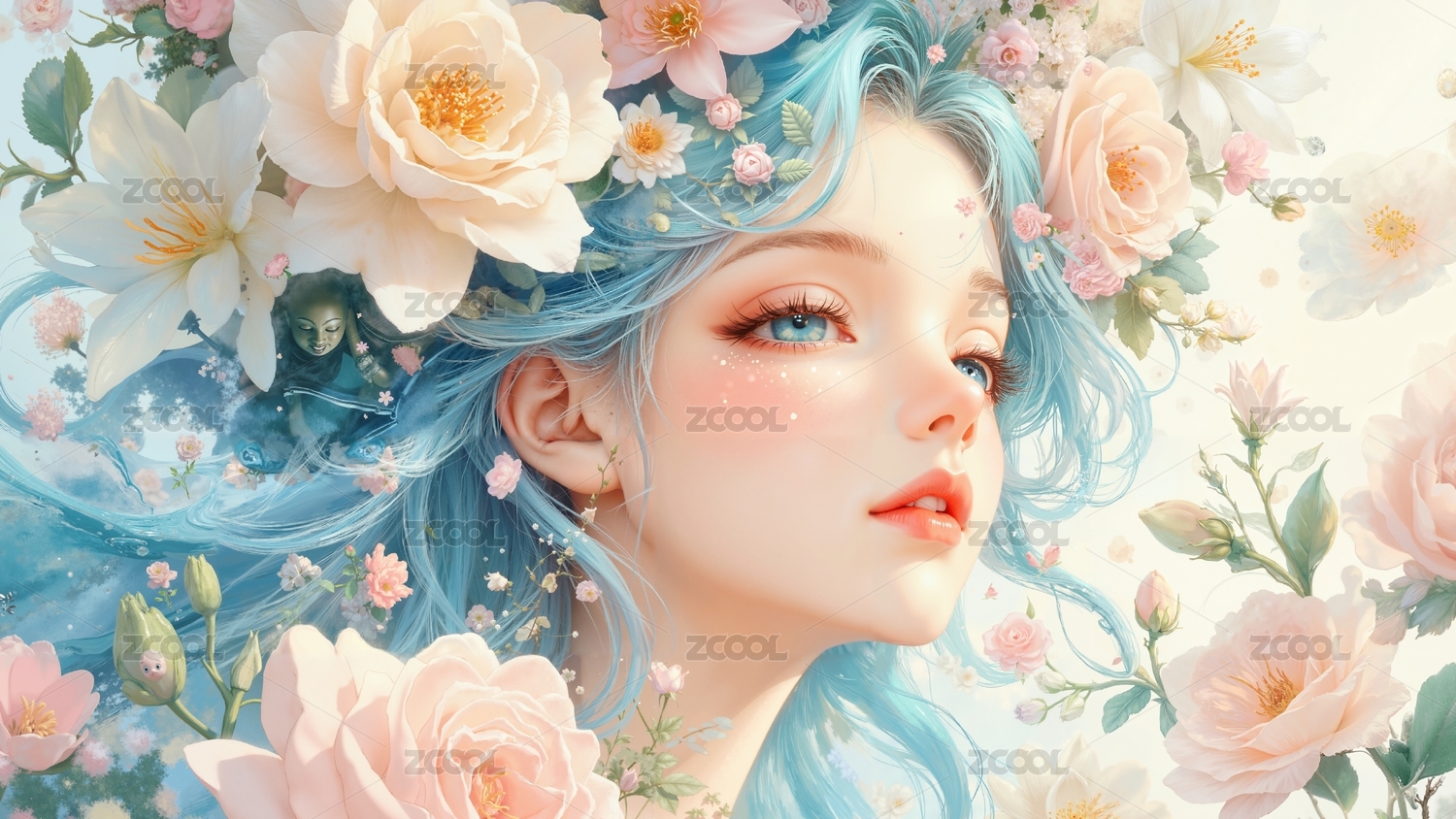 少女,雪白发丝花朵点缀,蓝色眼眸似梦幻