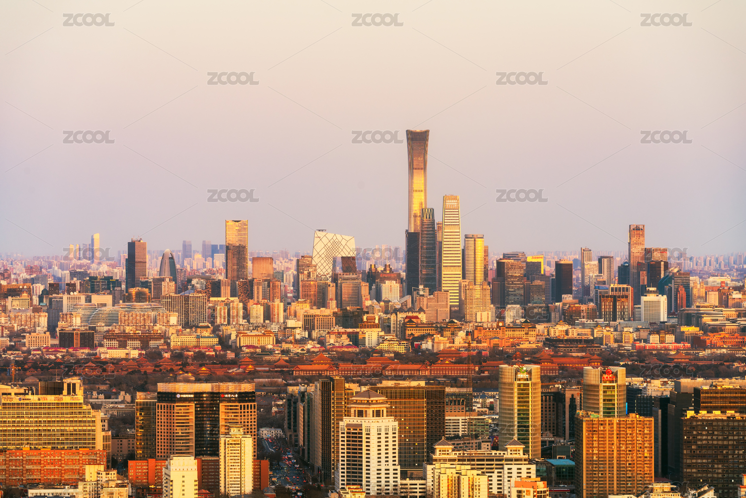 清晨朝阳下的北京CBD核心区城市天际线