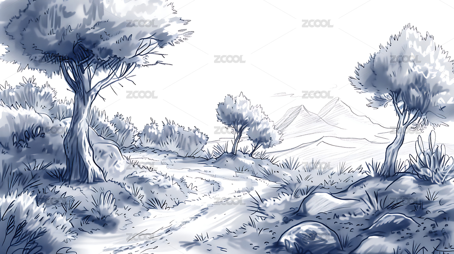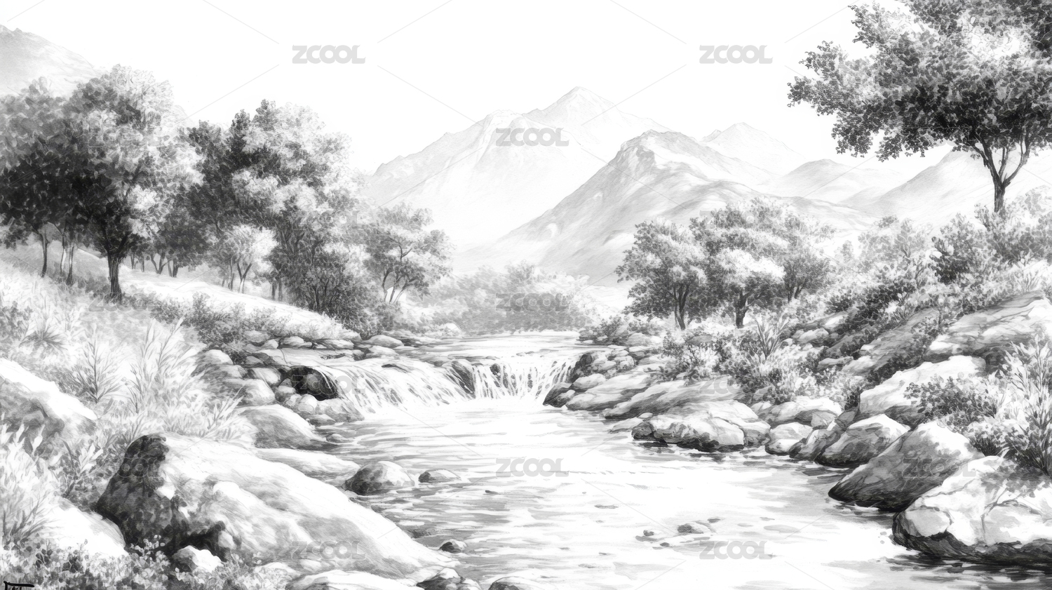黑白手绘山水画