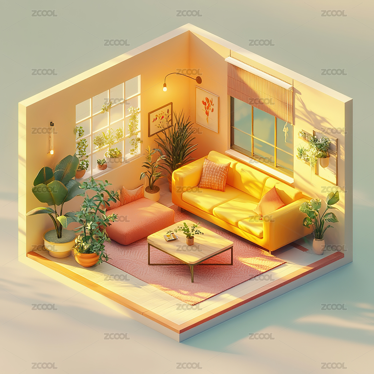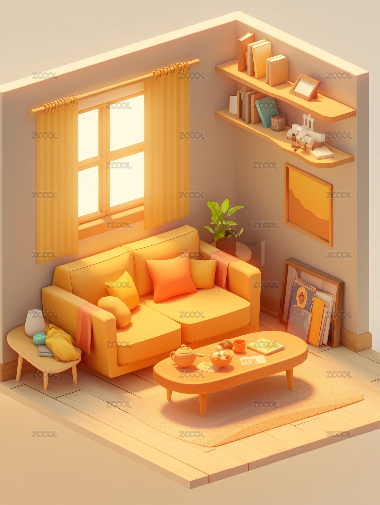 暖色客厅装修俯视立体轴测图3D卡通插画