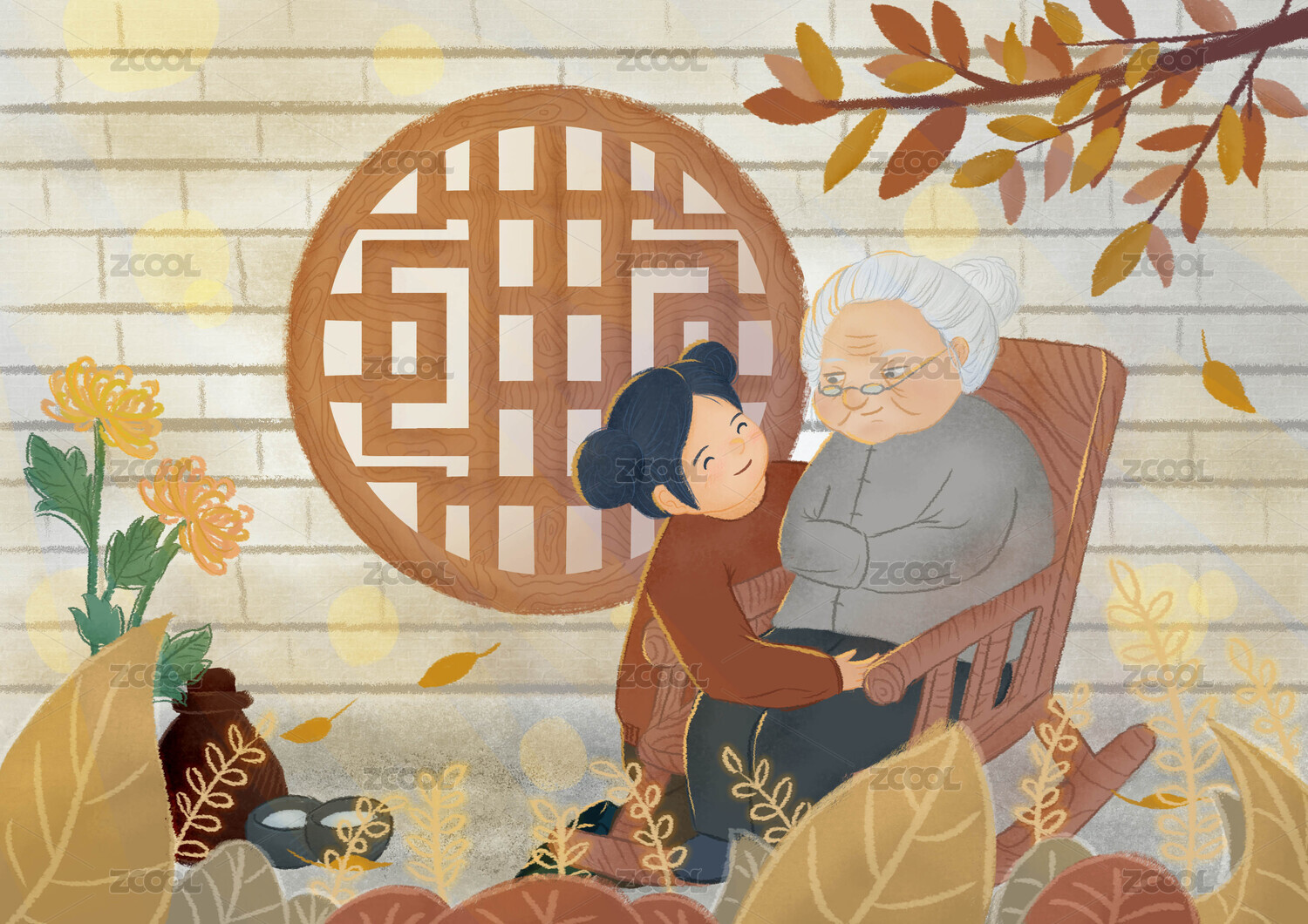 中国,重阳节,老人,秋天,秋季,陪伴,爱,女孩子,家庭,菊花