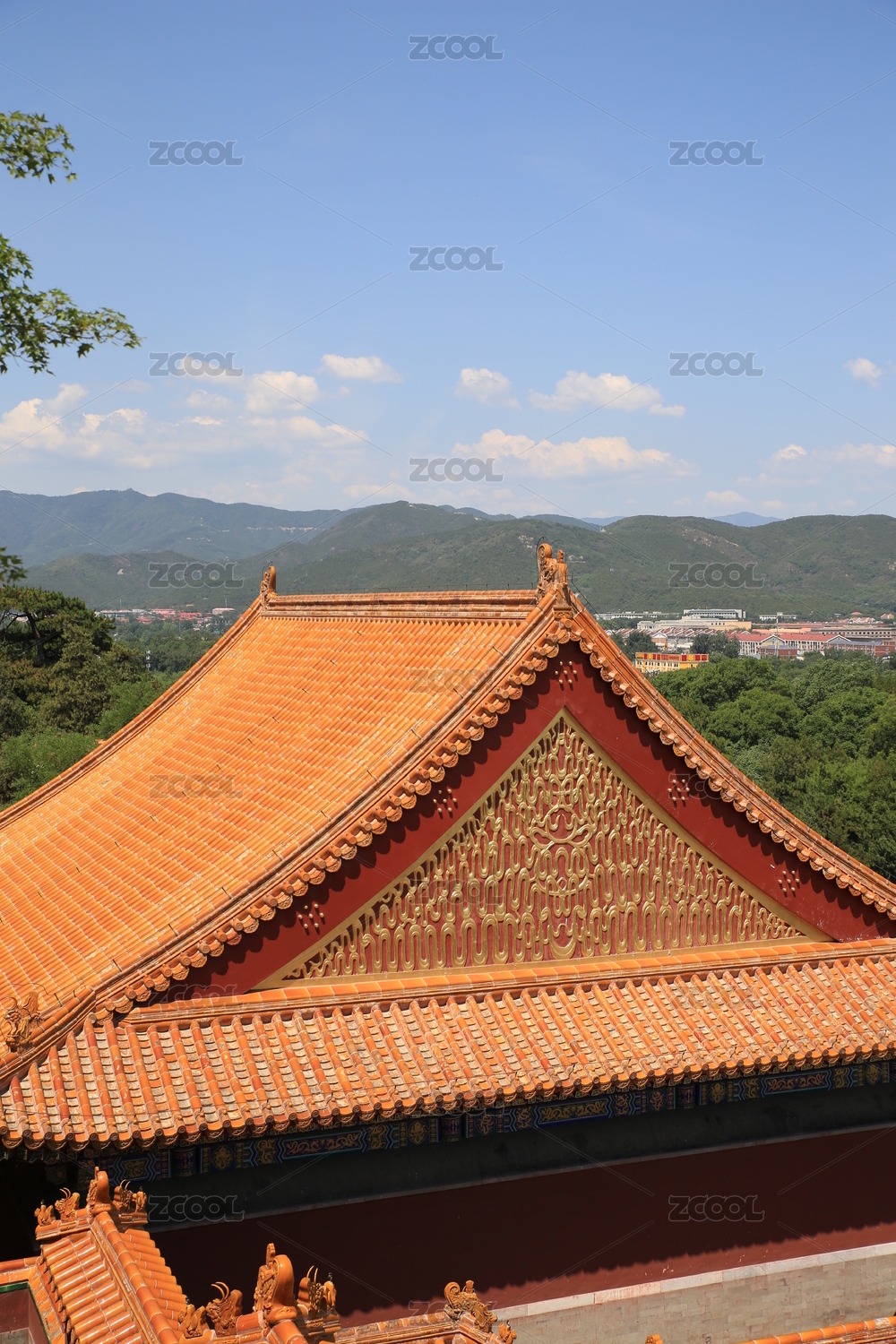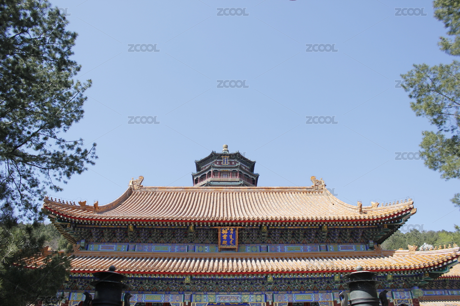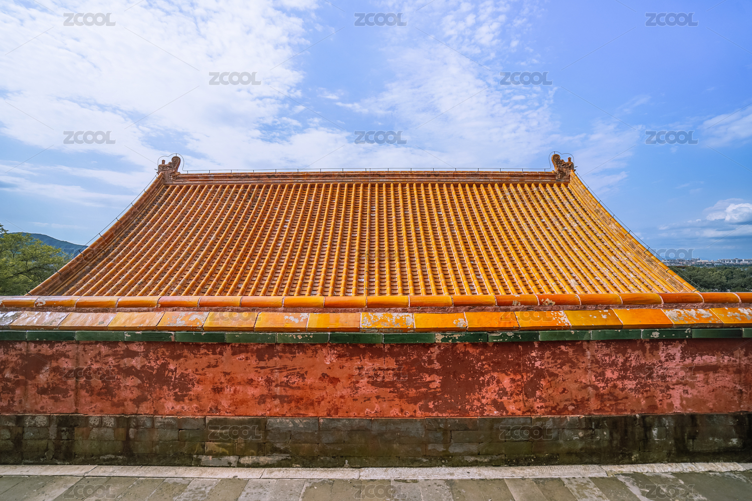 中国北京颐和园皇家古建一角——琉璃瓦瑞兽斗拱彩绘描金