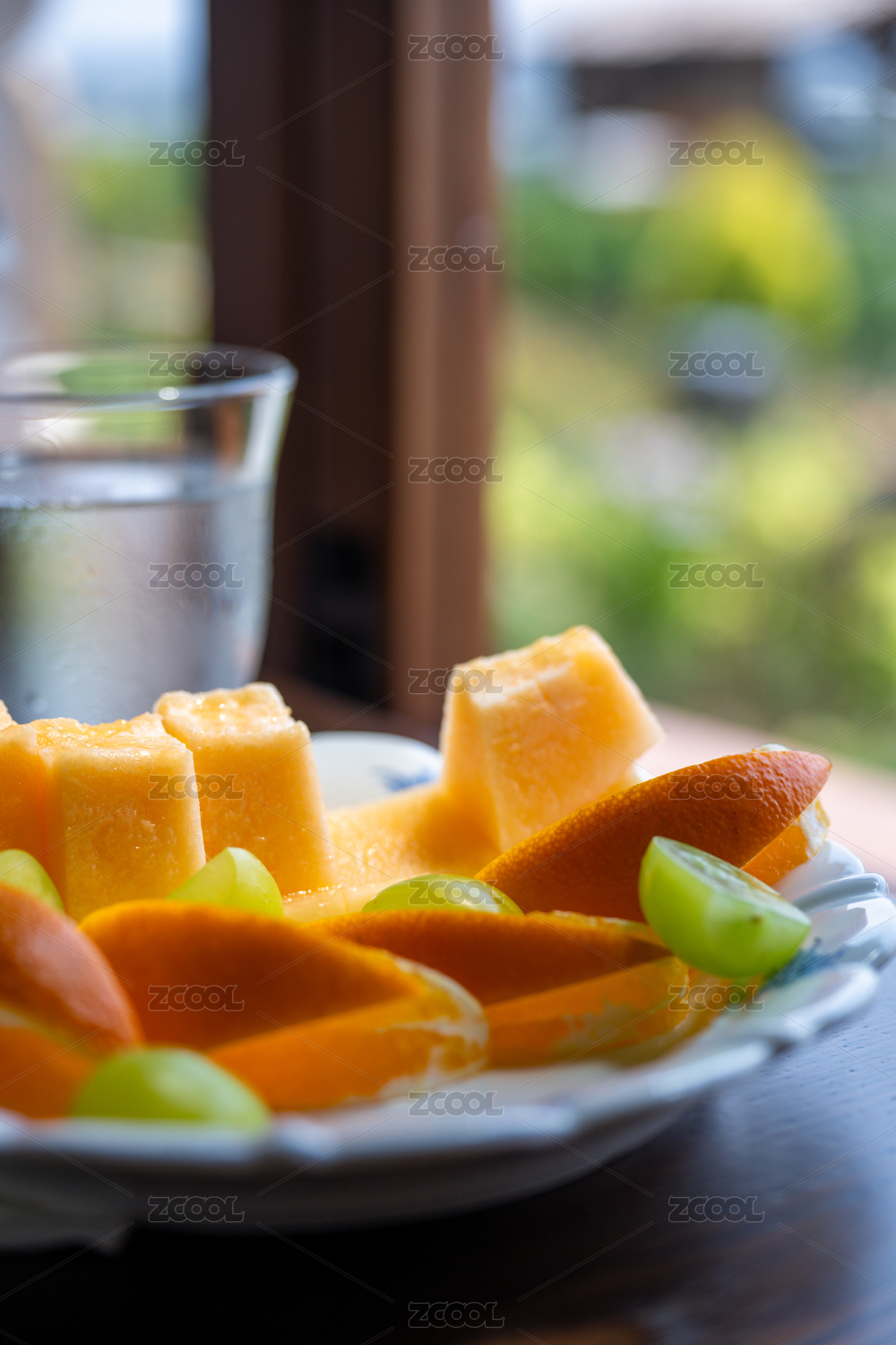 玻璃窗前实木桌上托盘里的香瓜切片