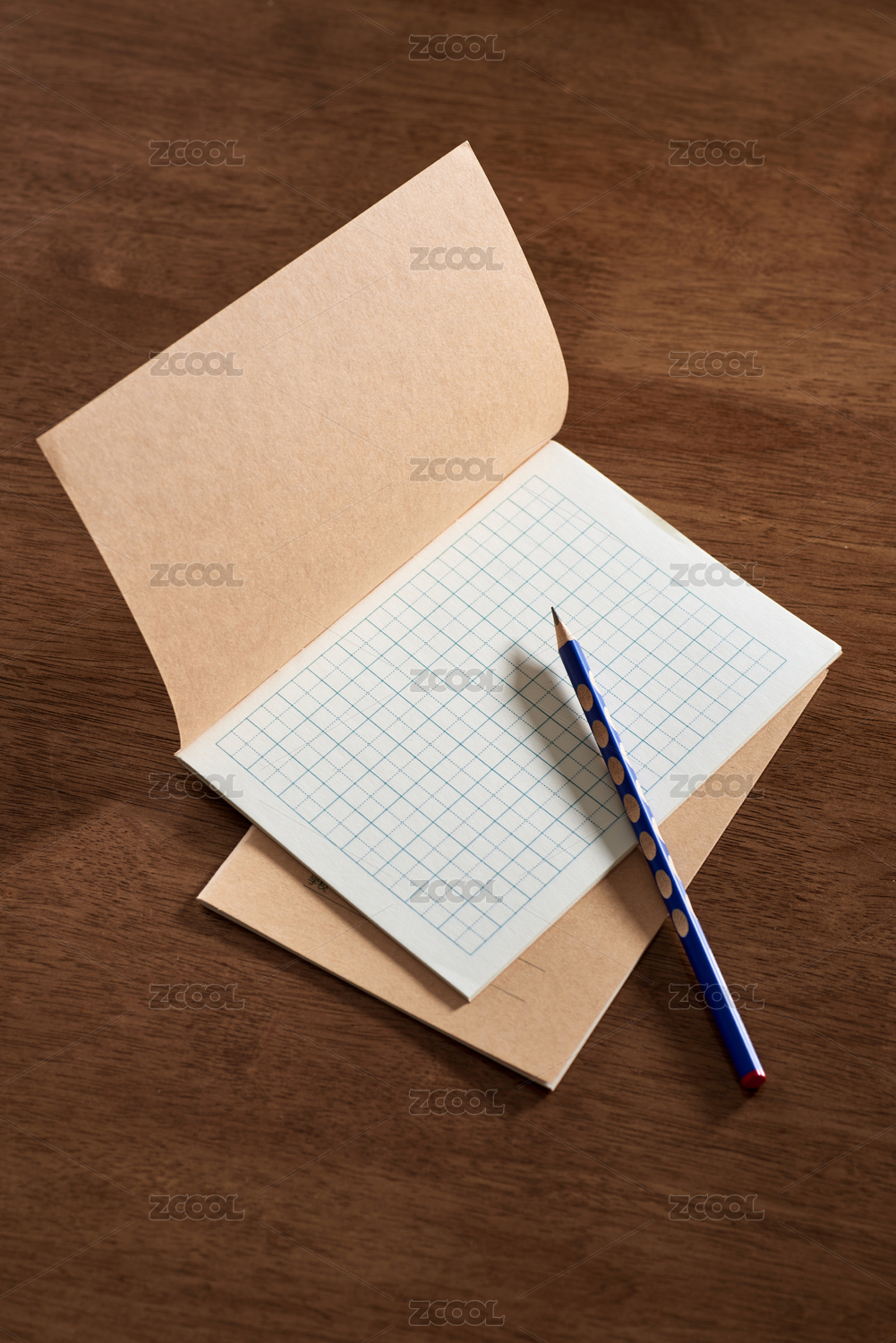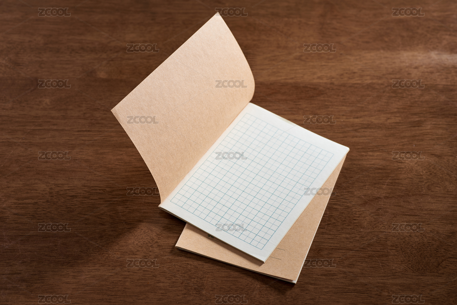空白的有书签的笔记本放在办公室木制纹理办公桌上搭配金色钢笔学习记笔记概念