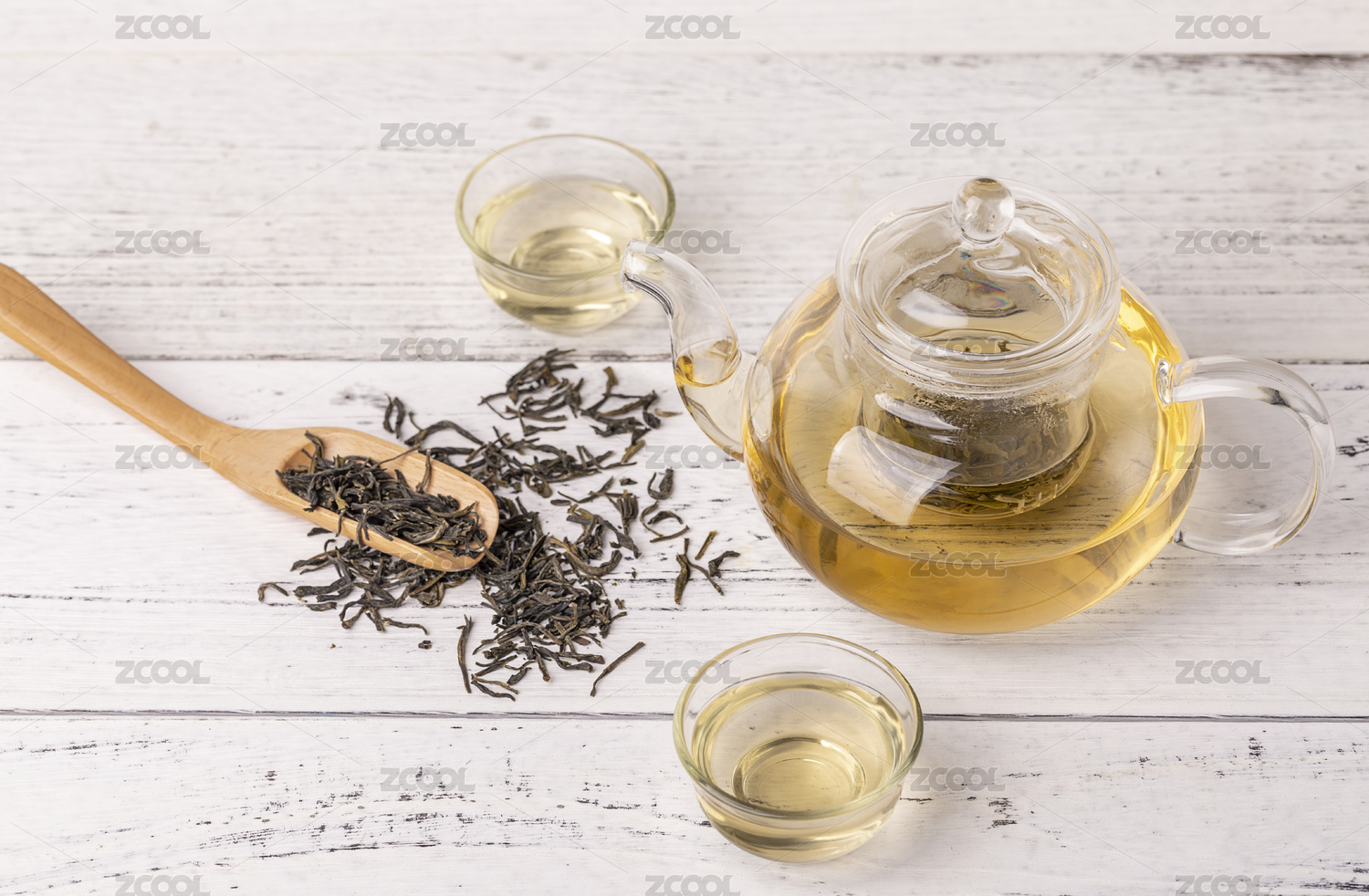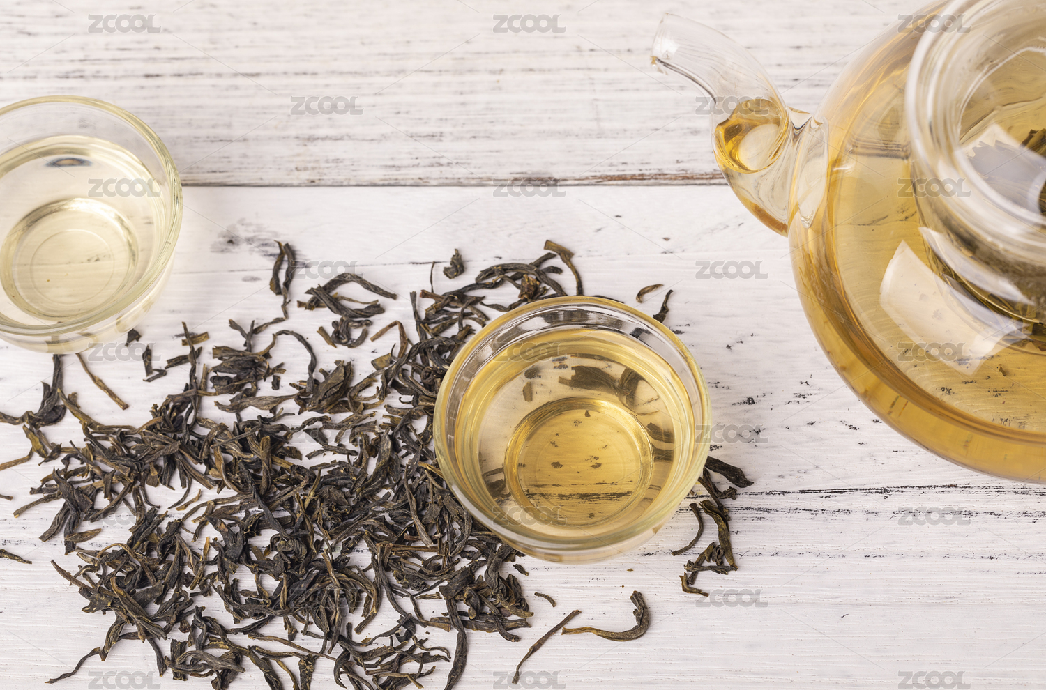 桌子上的茶杯和茶叶