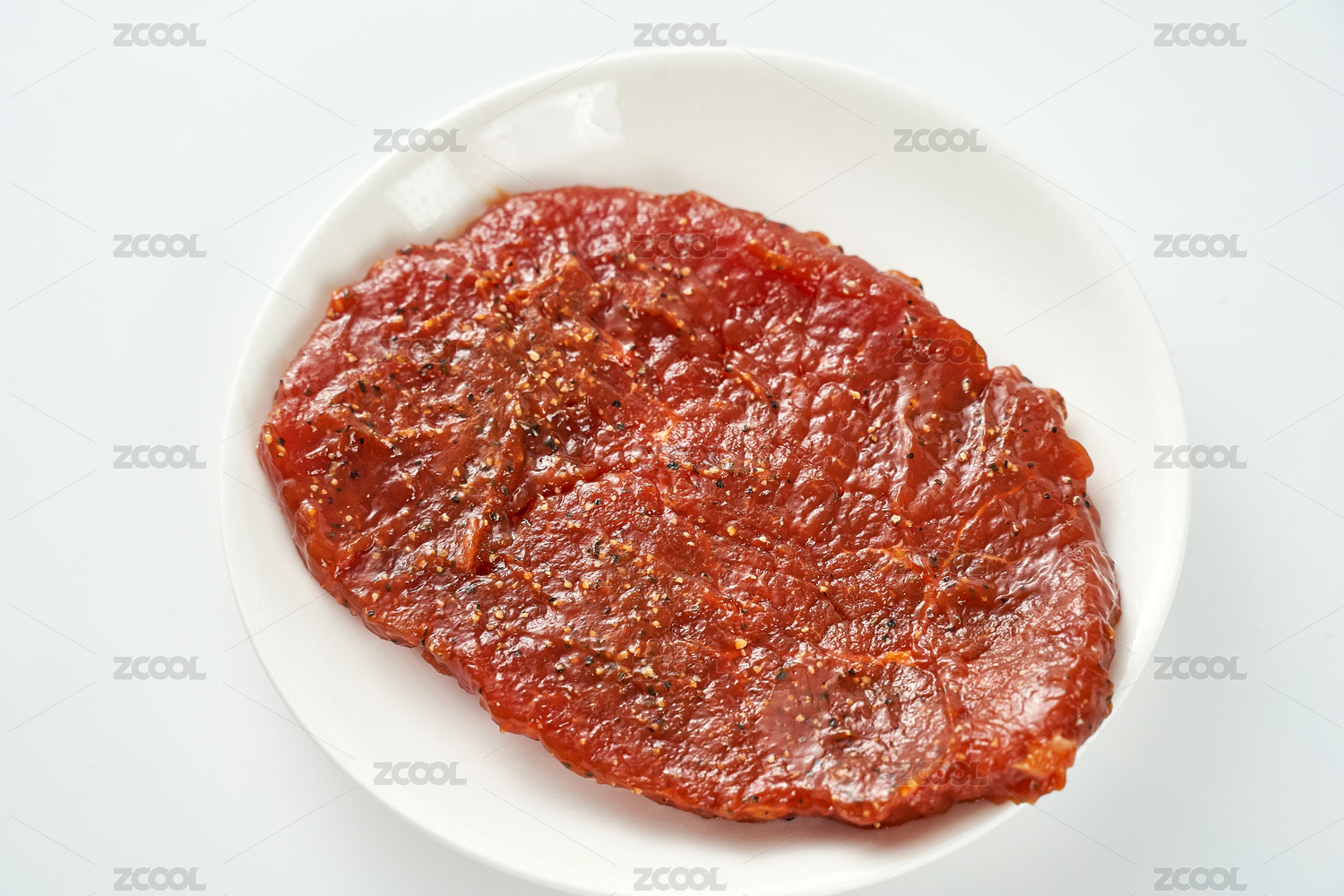 白色背景上餐具里摆放的腌制黑胡椒牛排肉