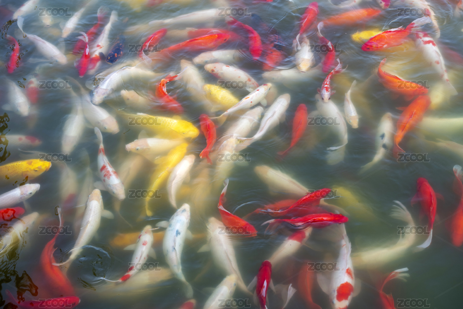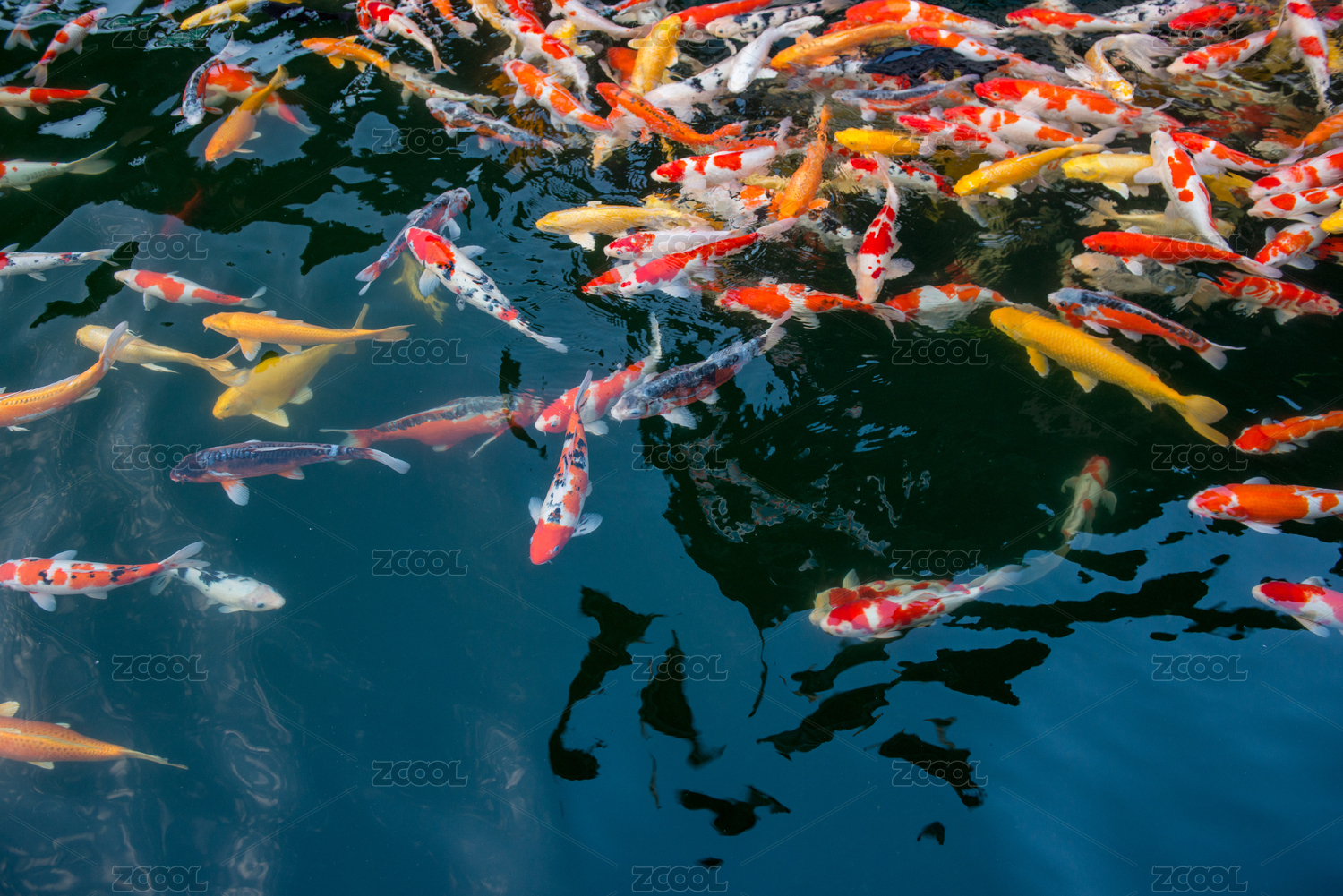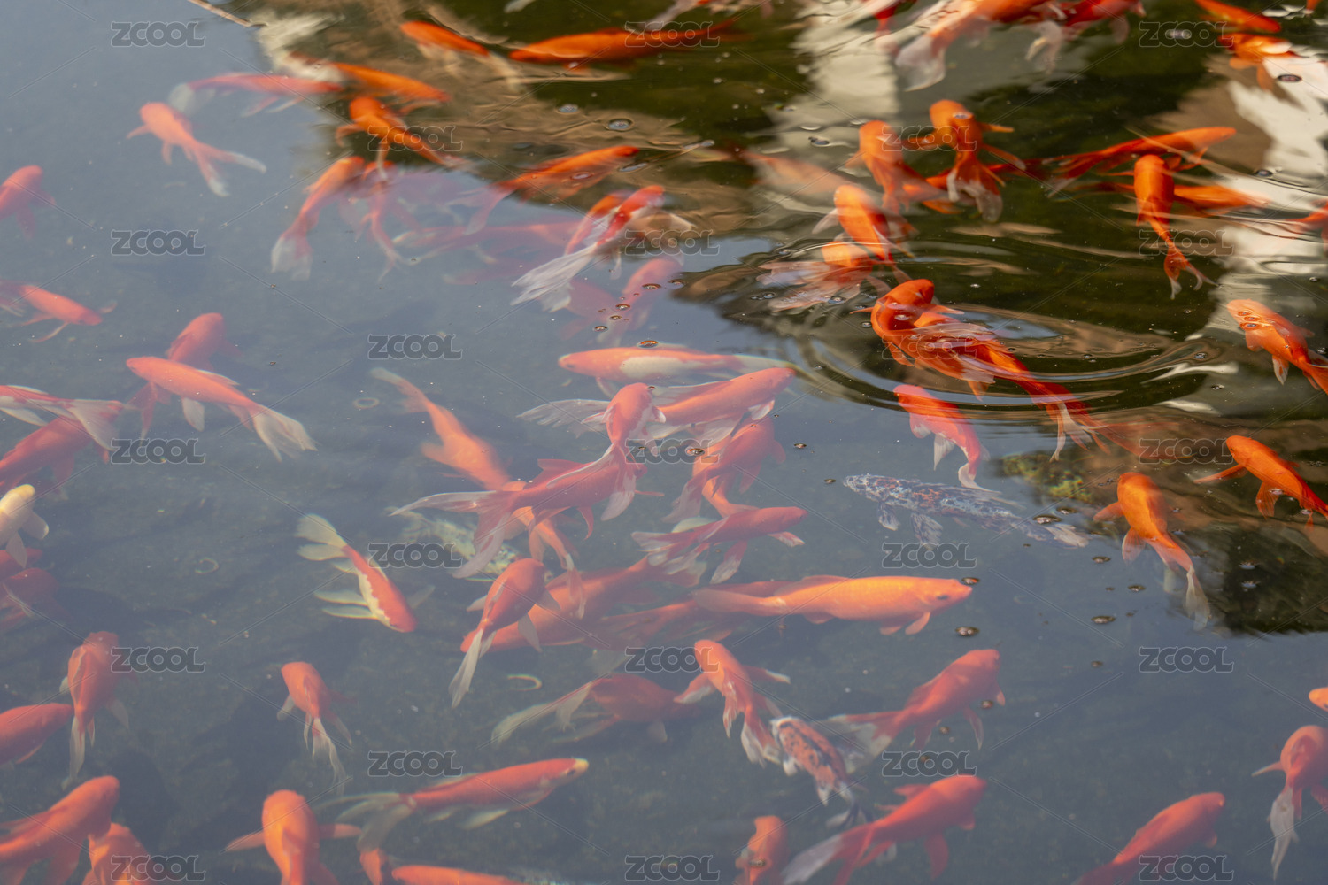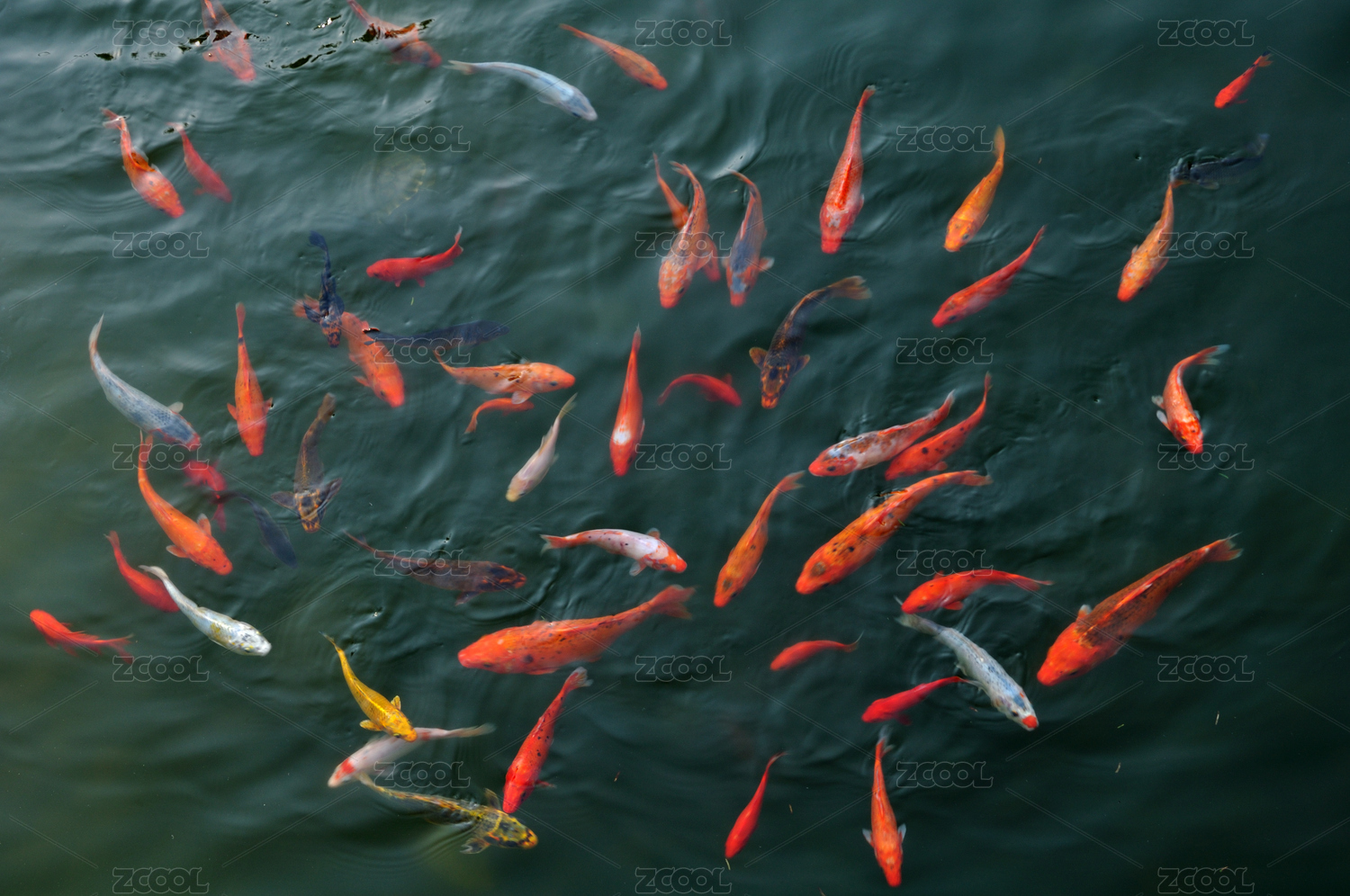 池塘中颜色艳丽追逐嬉戏的锦鲤