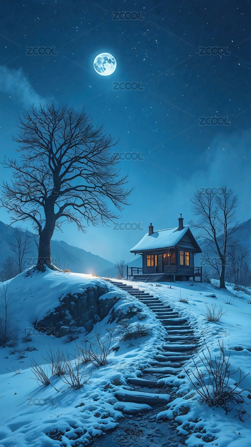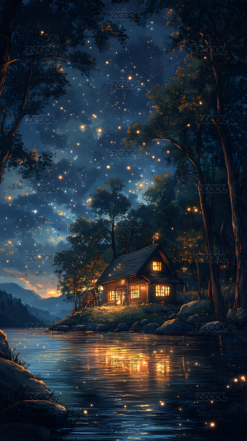 木屋,月亮,夜晚,森林,星星,树木,秋天,叶子,道路,光线