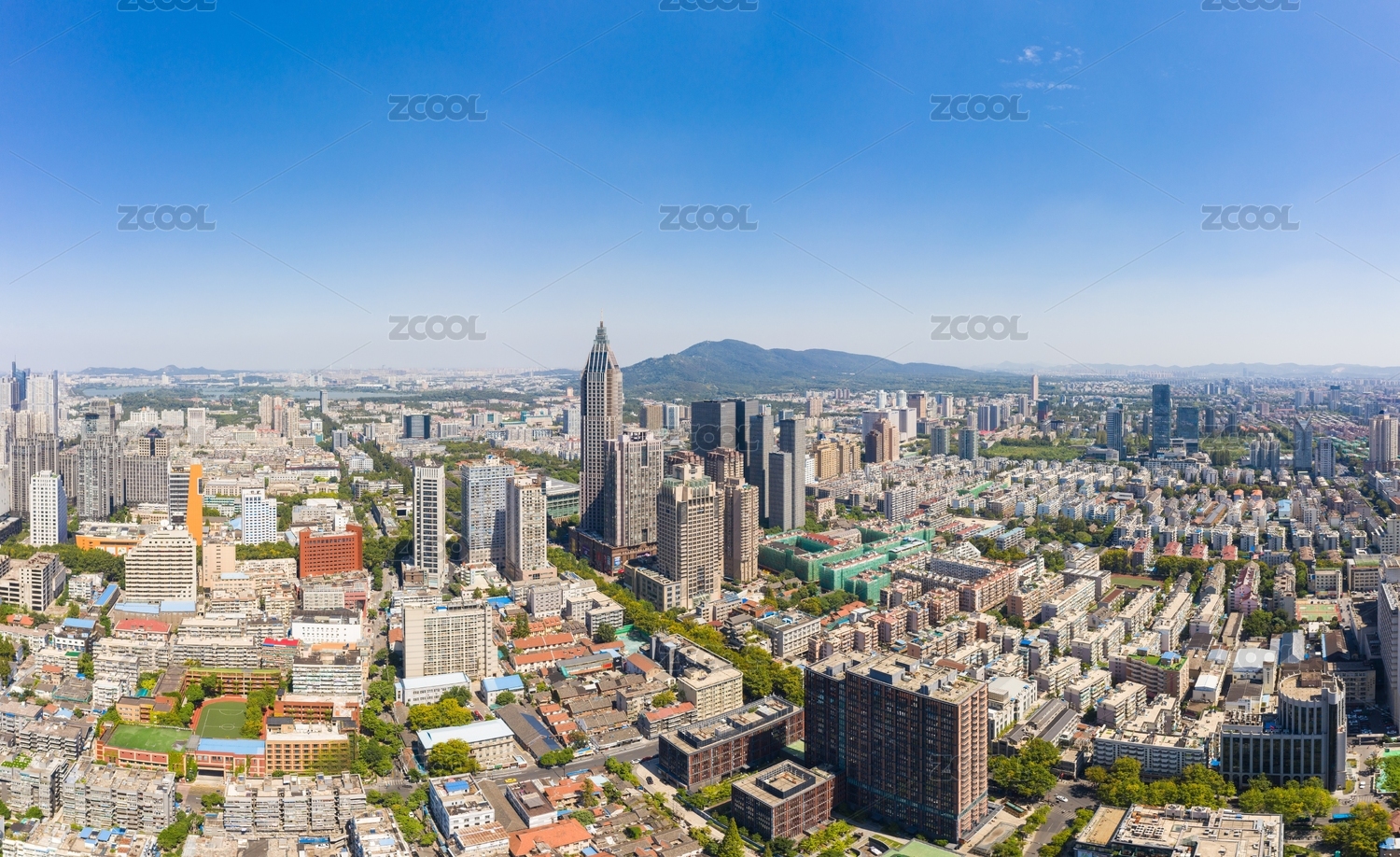 晴朗的蓝天下南京市中心大行宫地区的高楼与远处的紫金山