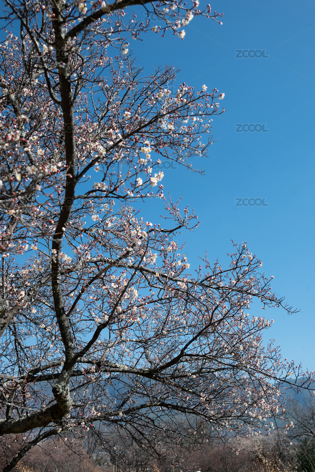晴朗的天空下盛开的白色梅花