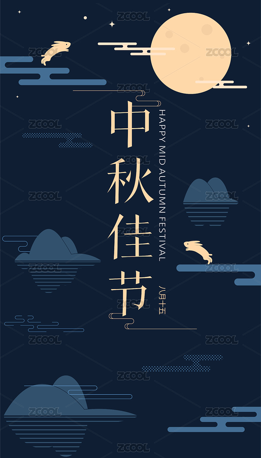 八月十五中秋节满月矢量插画,兔子和祥云符号,山水矢量插画