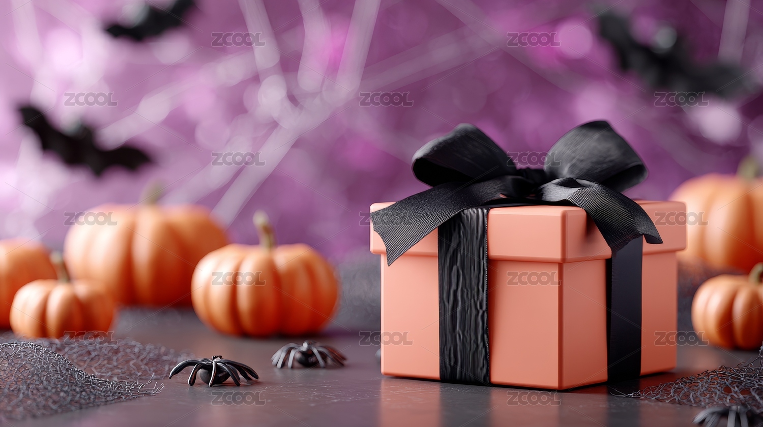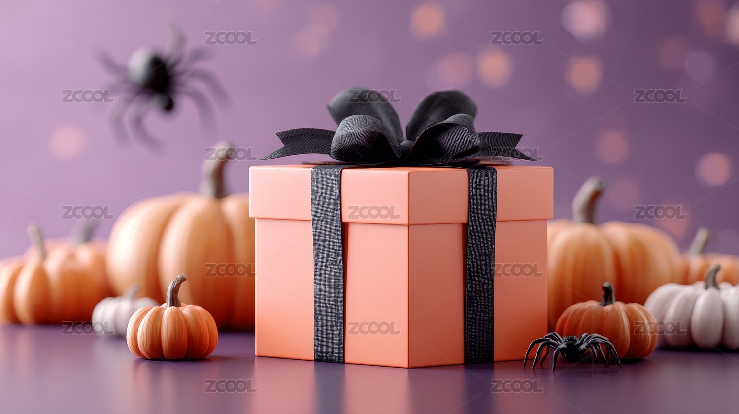 万圣节礼物盒与橙色南瓜及黑色蜘蛛装饰