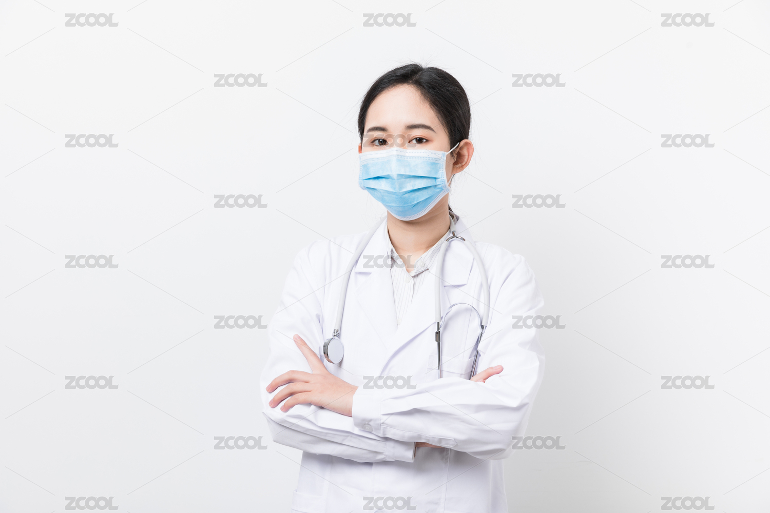 戴着口罩挂着听诊器女医生摆手臂交叉的姿势