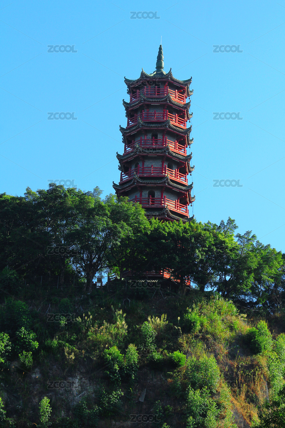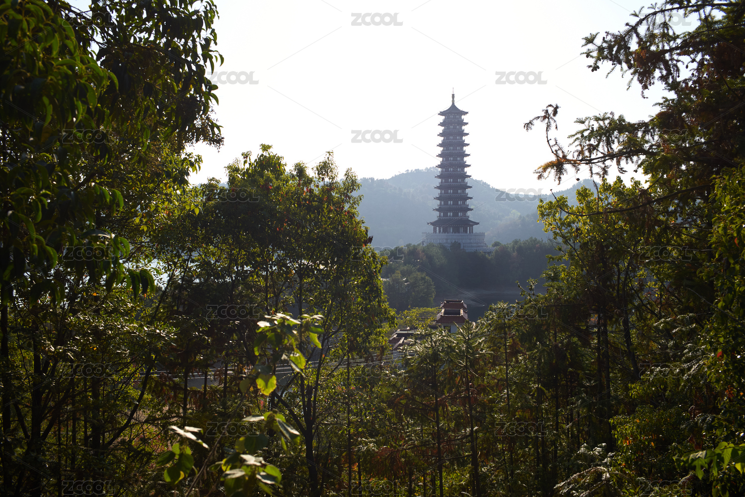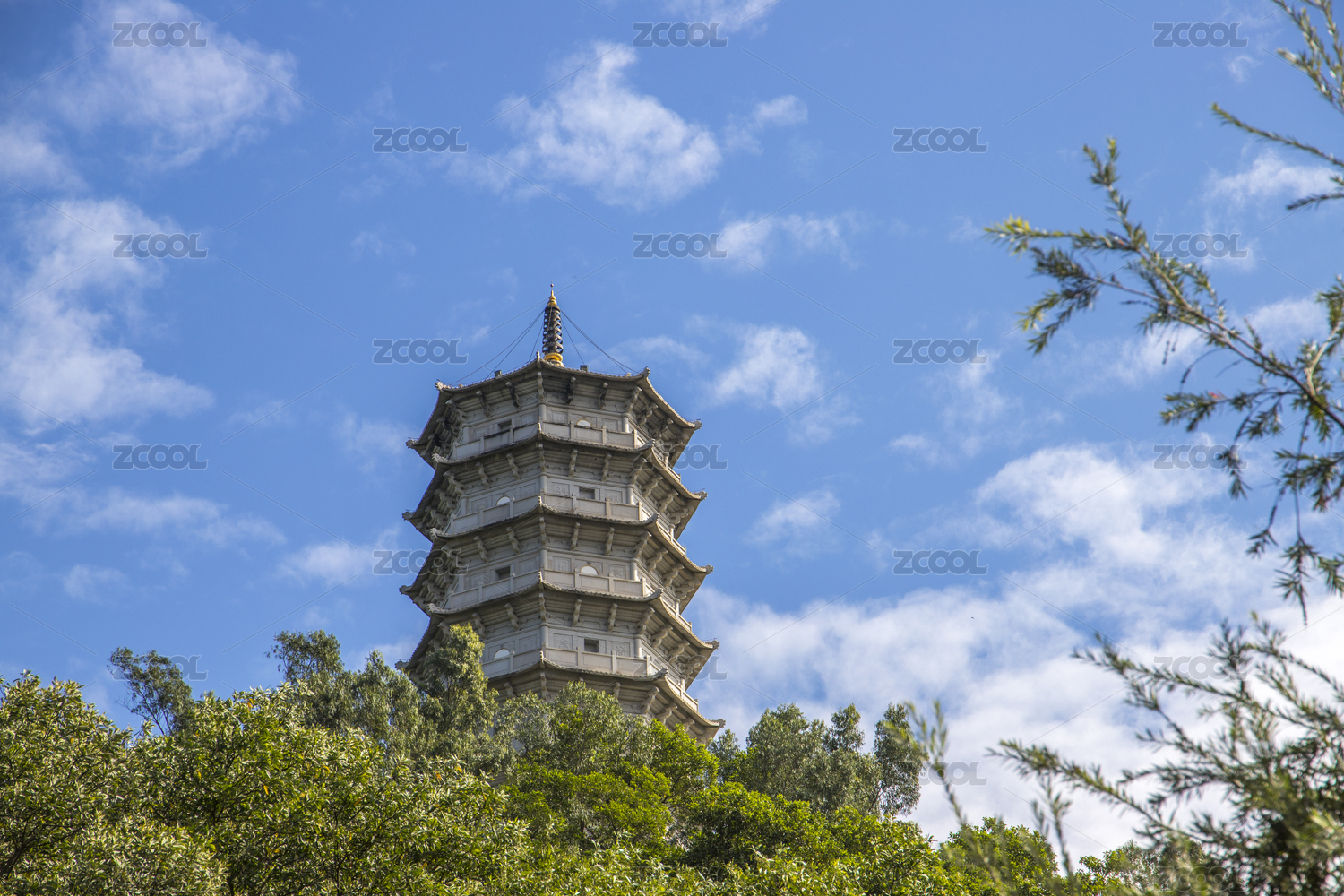 山顶一座中国传统宗教建筑中的佛塔