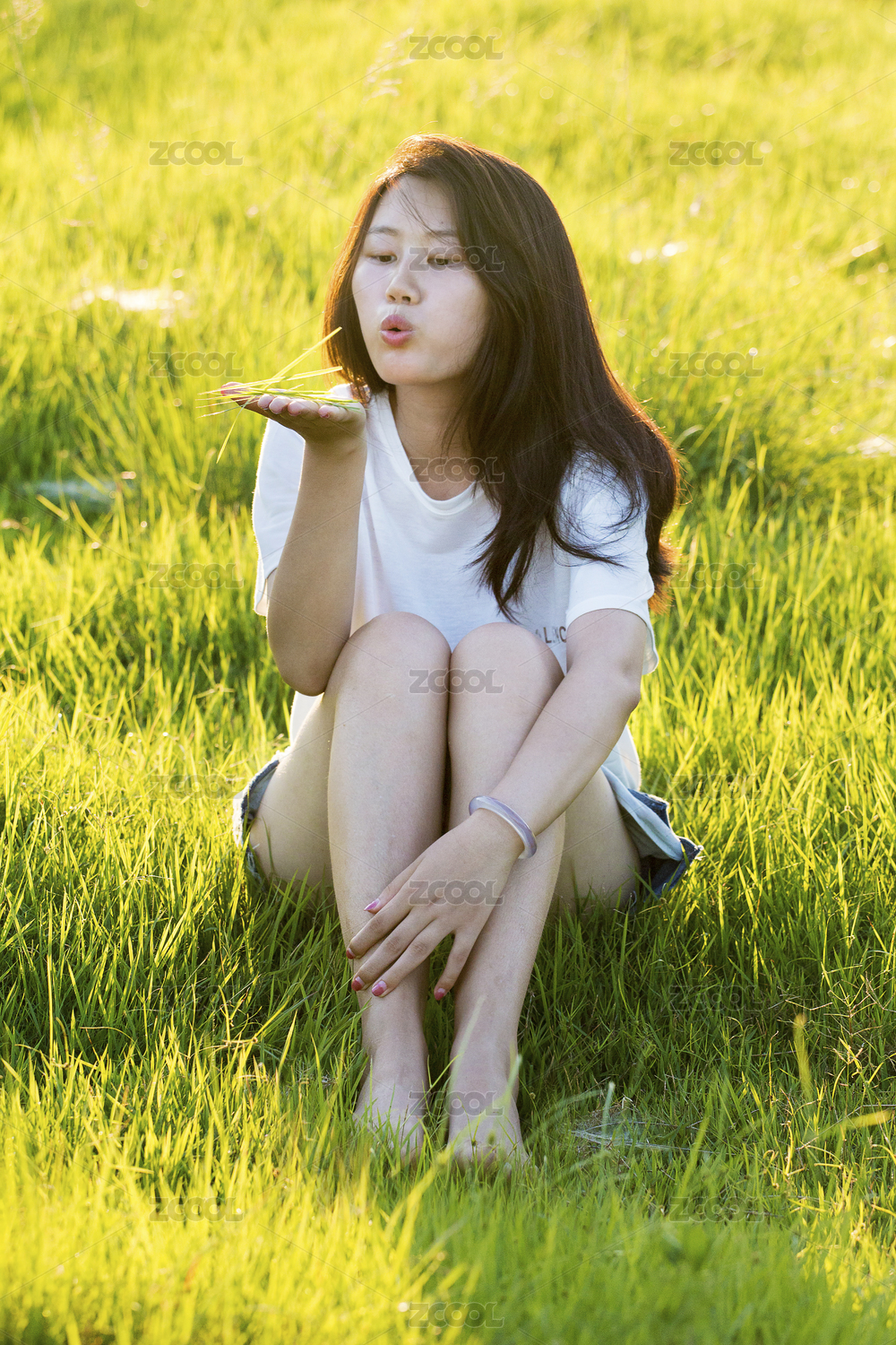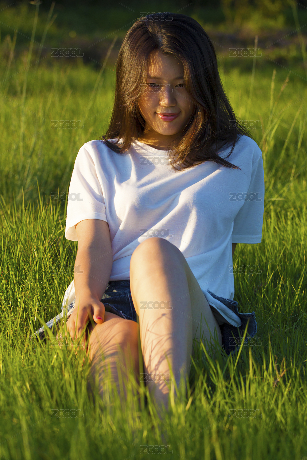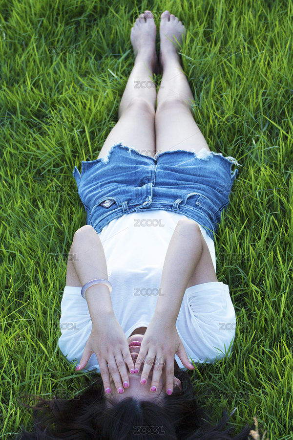 年轻漂亮的中国女子躺在相机绿色的草原微笑