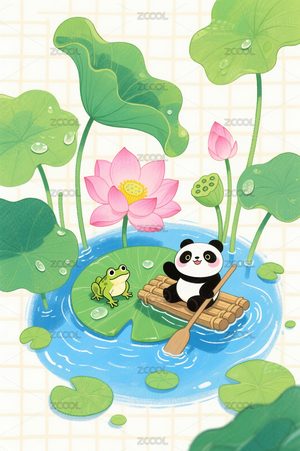 小暑,熊猫,二十四节气,大暑,插画,夏至,六一儿童节,儿童插画,国潮,池塘
