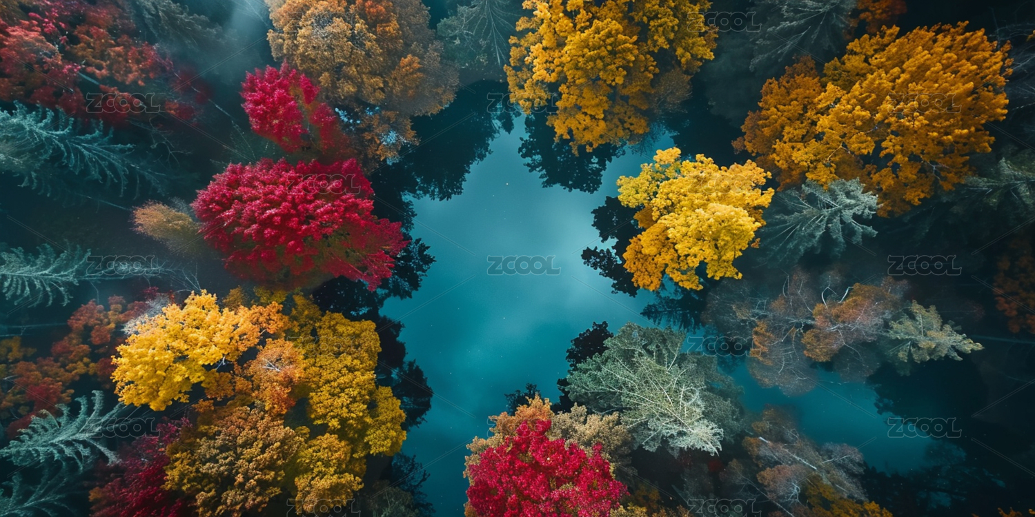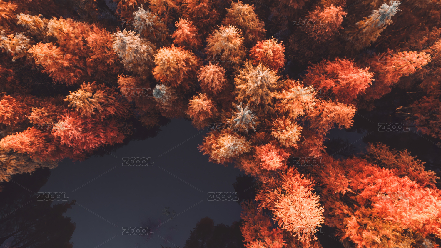航拍秋季黎明拂晓的山间湖泊与枫叶林