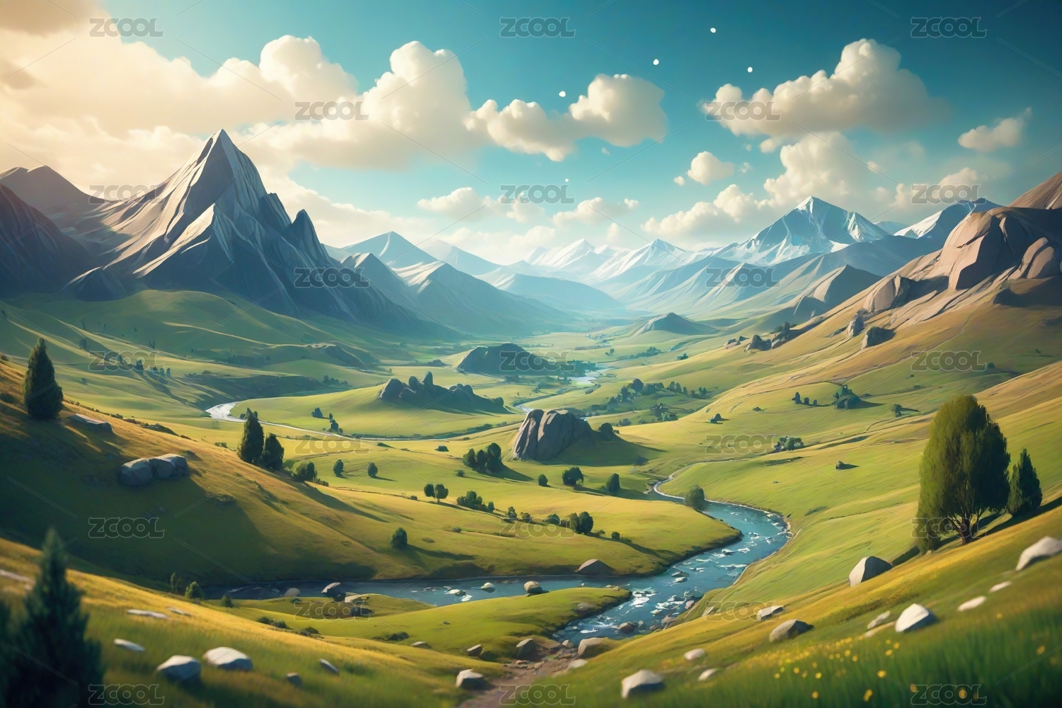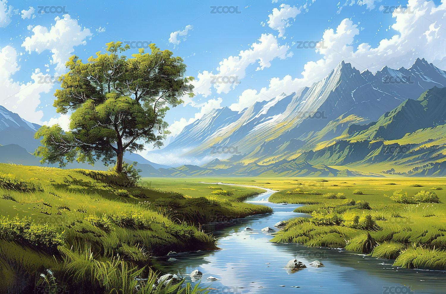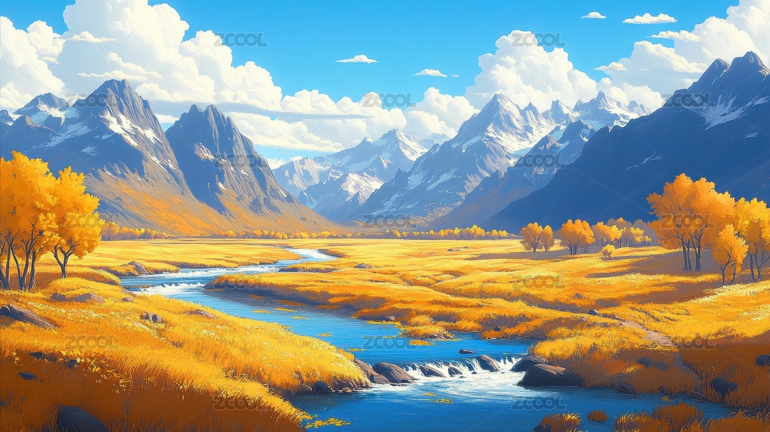 金色草甸蜿蜒河流雪山雄伟壮丽