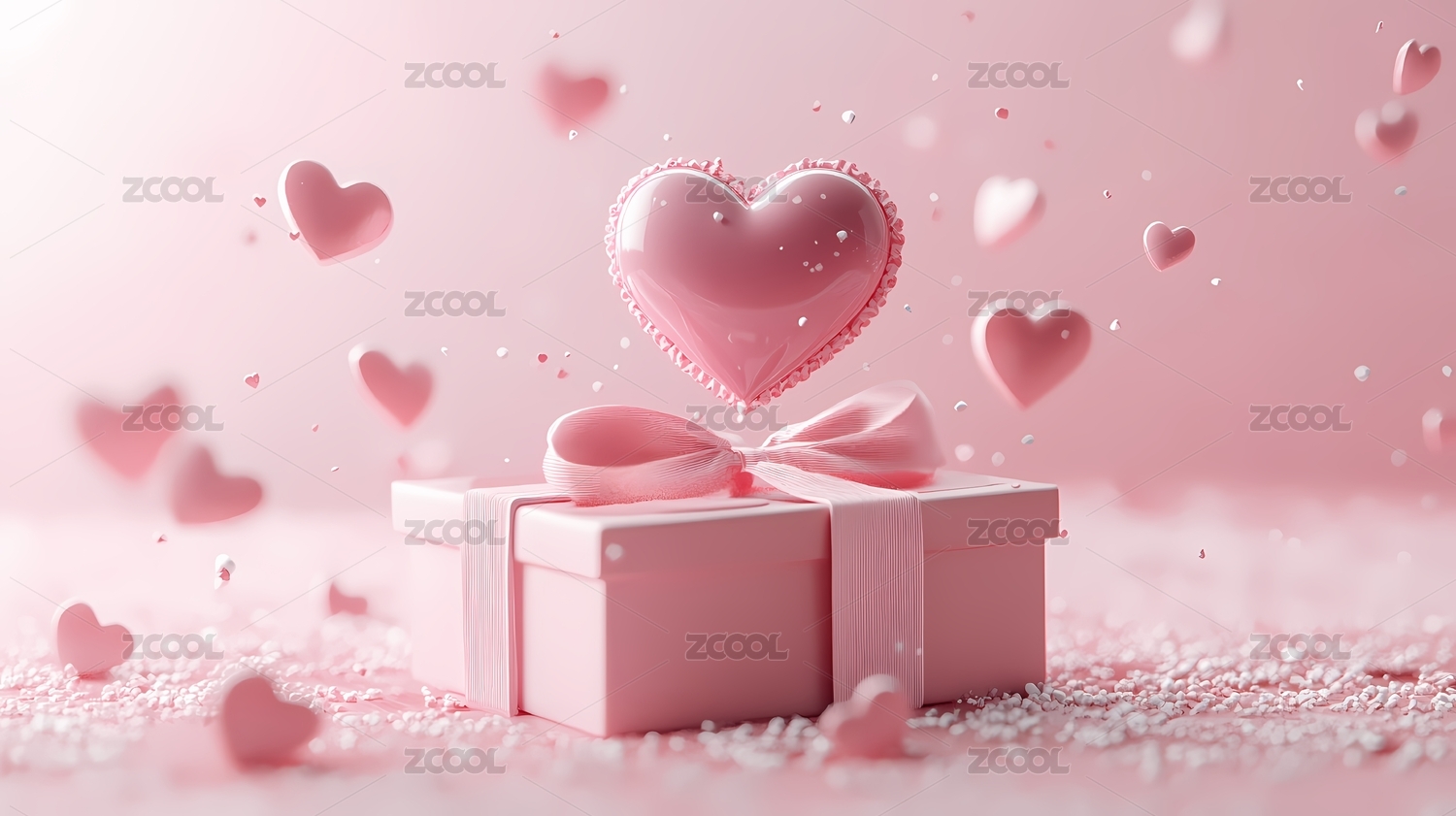 绑着丝带的礼品盒周围漂浮着粉色爱心