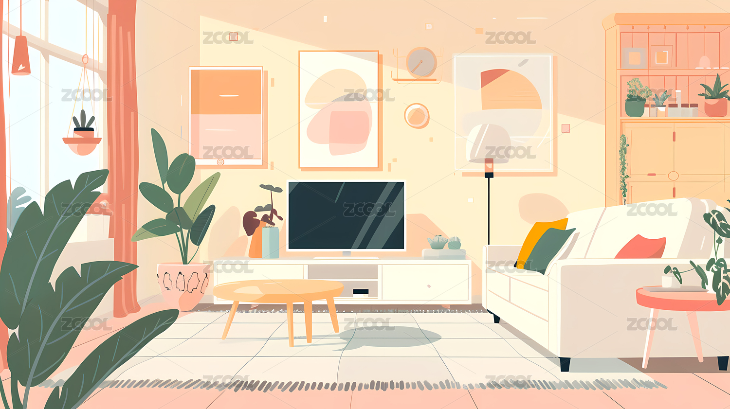 客厅,家装,插画,矢量,扁平,房子,装修,粉色,温馨,沙发