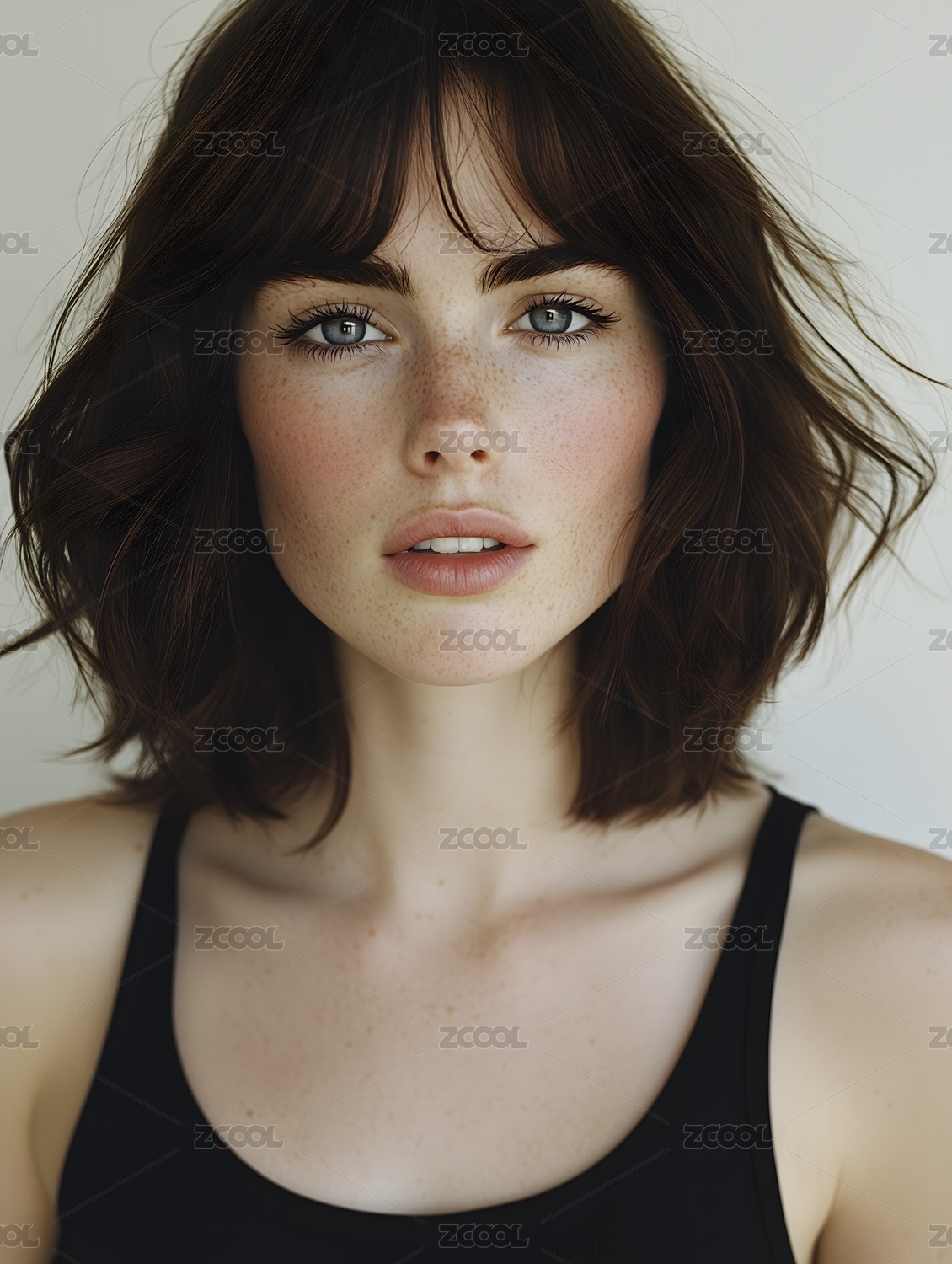 一位棕色短发雀斑女孩的肖像,面容精致