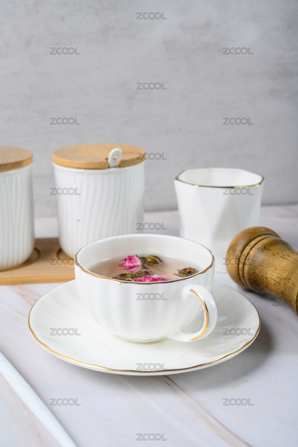桌面上的杯子里的香甜可口的玫瑰花茶
