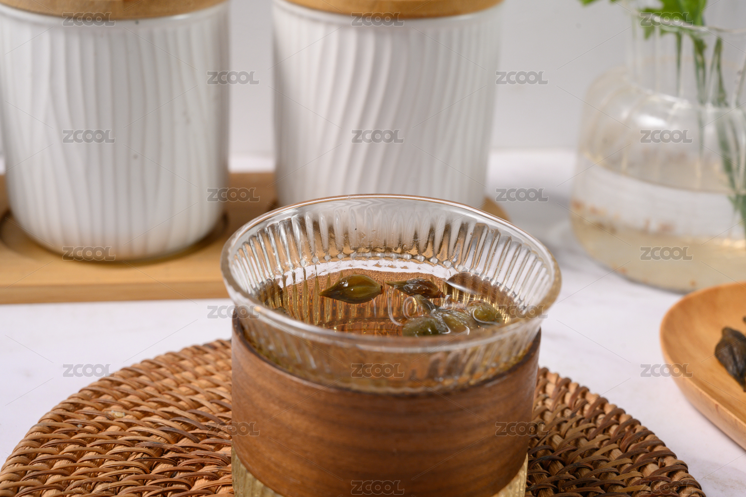 桌面上的杯子里的甘甜可口的茉莉吐珠茶