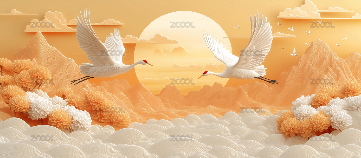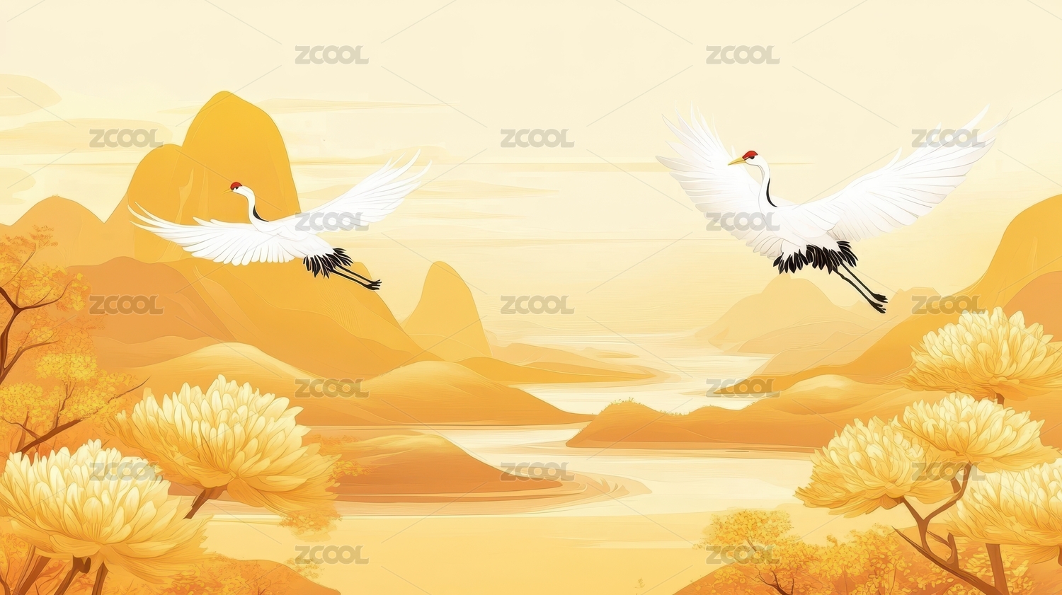重阳节中国白鹤菊花夕阳风景氛围插画
