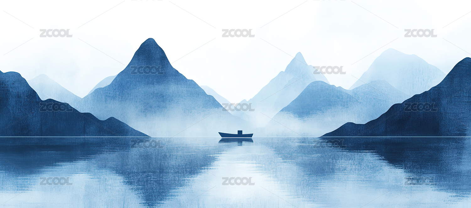 蓝色水墨意境山水画风景装饰画插画