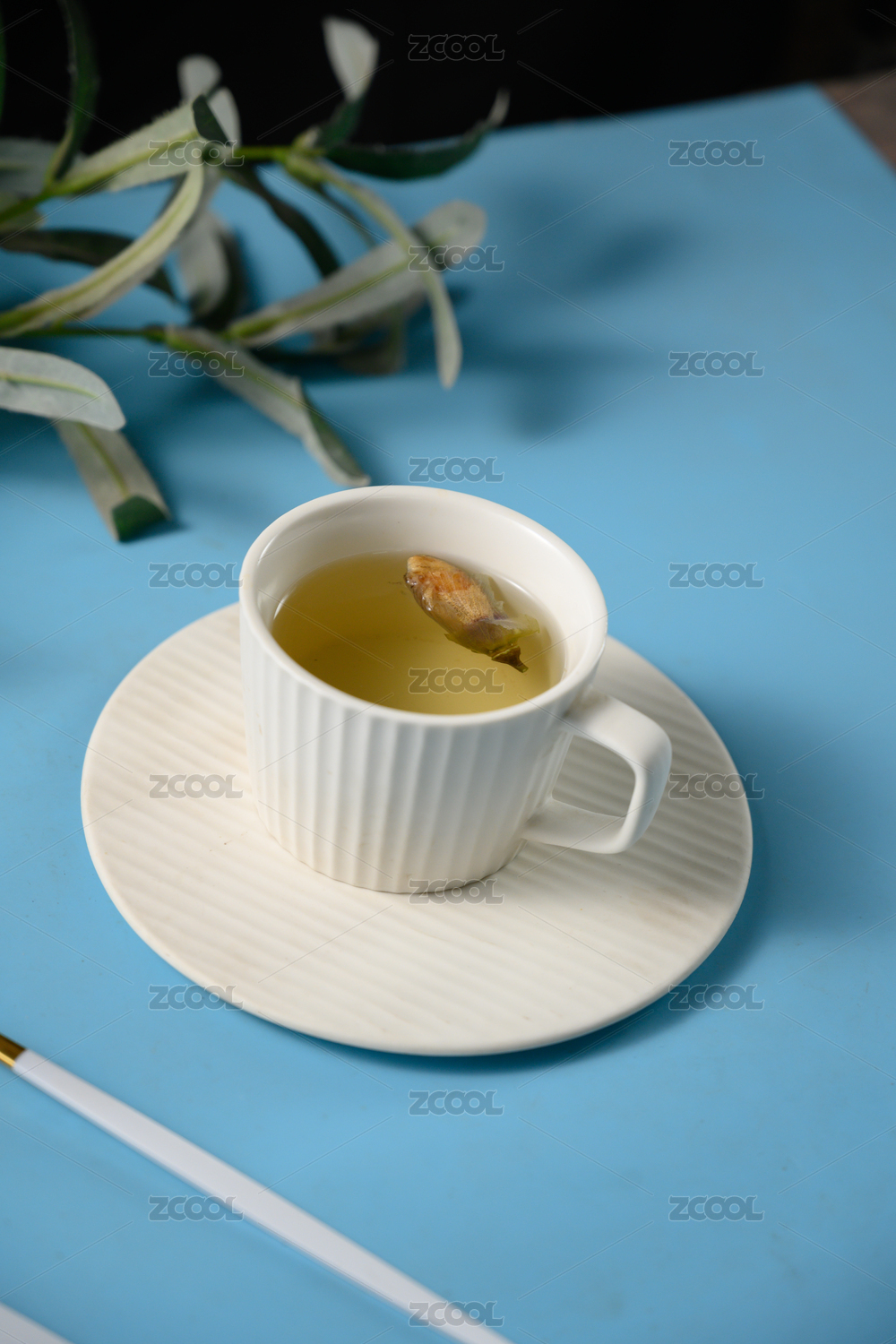 桌面上的杯子里的甘甜可口的金盏菊花茶
