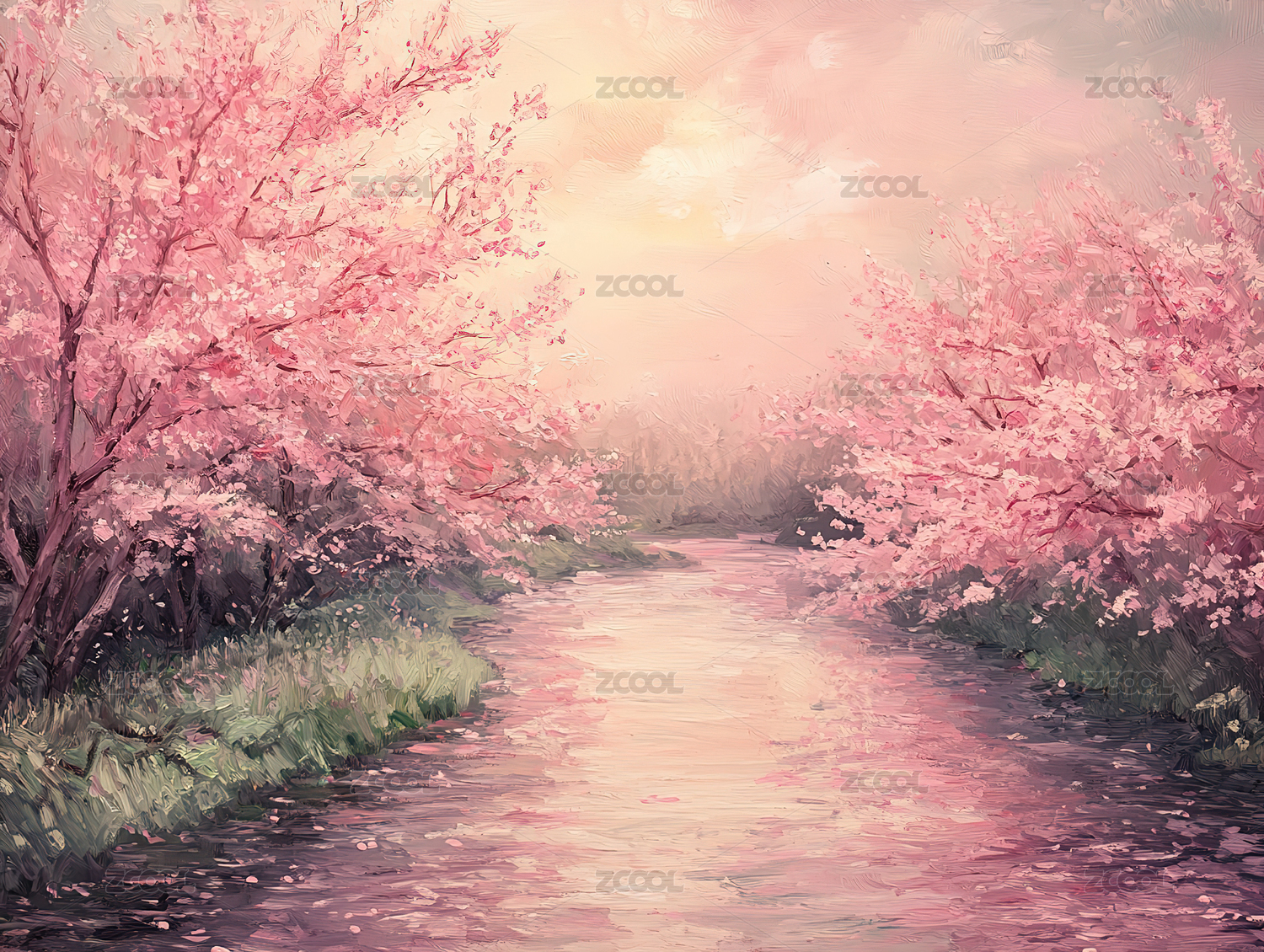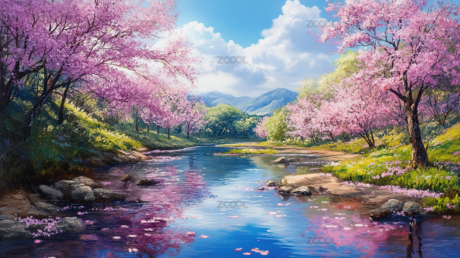 樱花草地植物河流天空唯美风景